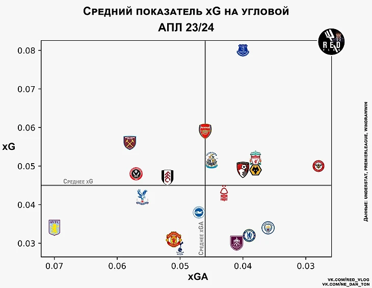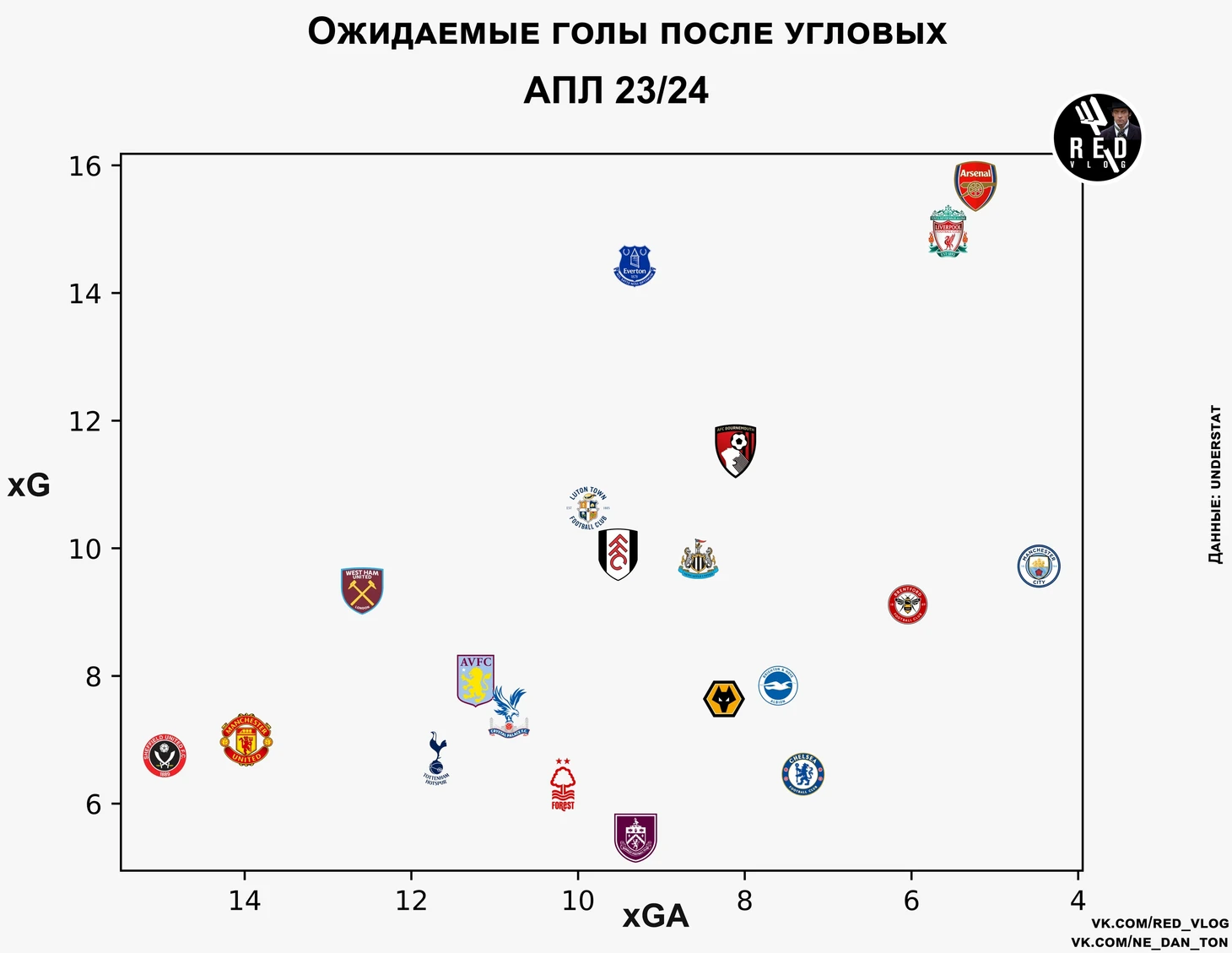 11 голов (13.98 xGA) пропущено при 274 угловых. Если смотреть на фактические цифры - выглядит очень плохо. Лишь у «Шеффилд Юнайтед» было чуть хуже. Но если посчитать средний xG на каждый угловой, то цифры выглядят не столь устрашающи, а просто плохими.
