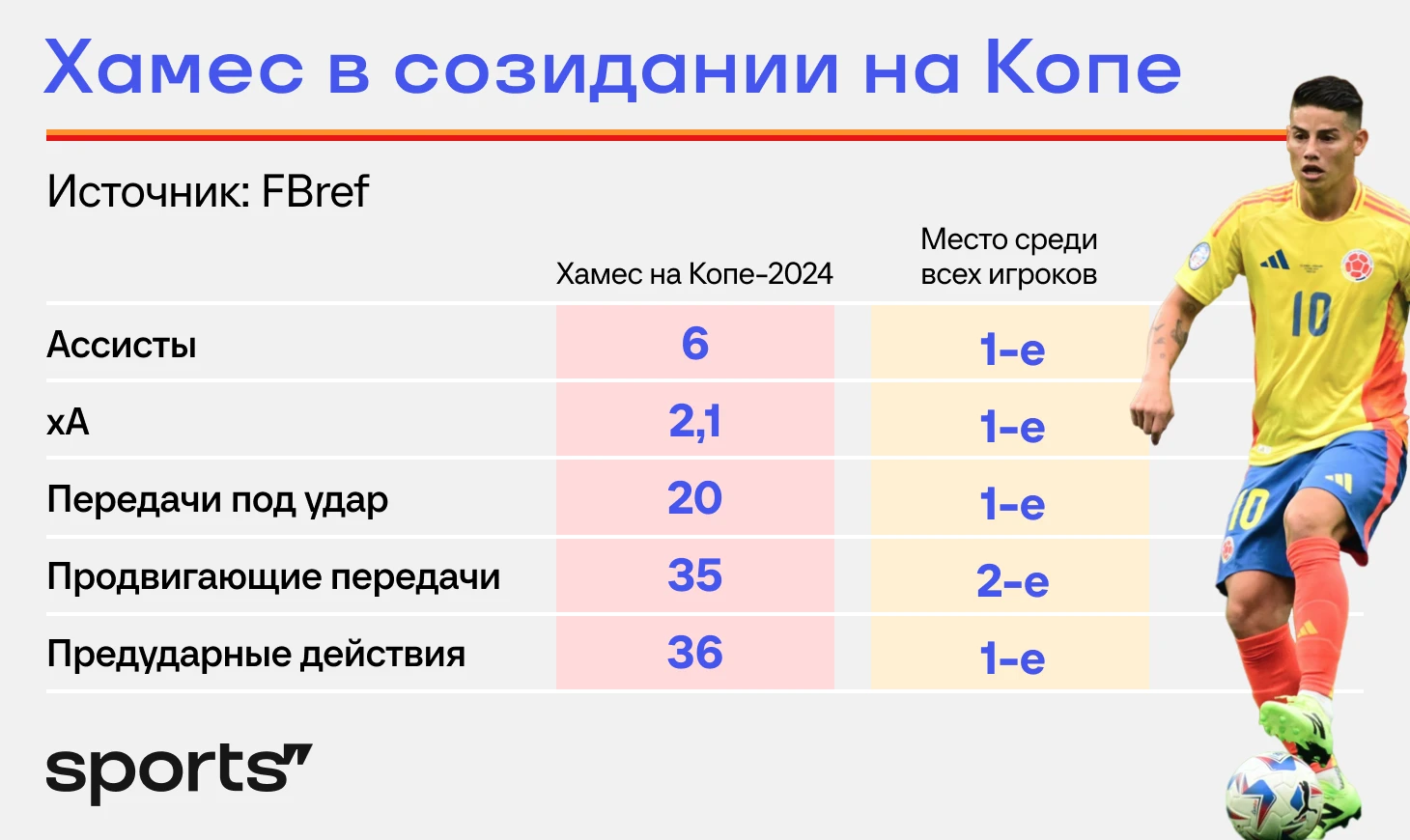Хамес и правда вдохновенно провел турнир. Он стал лучшим игроком Копы, превзошел мощный показатель Месси по ассистам и чуть не привел Колумбию к титулу.