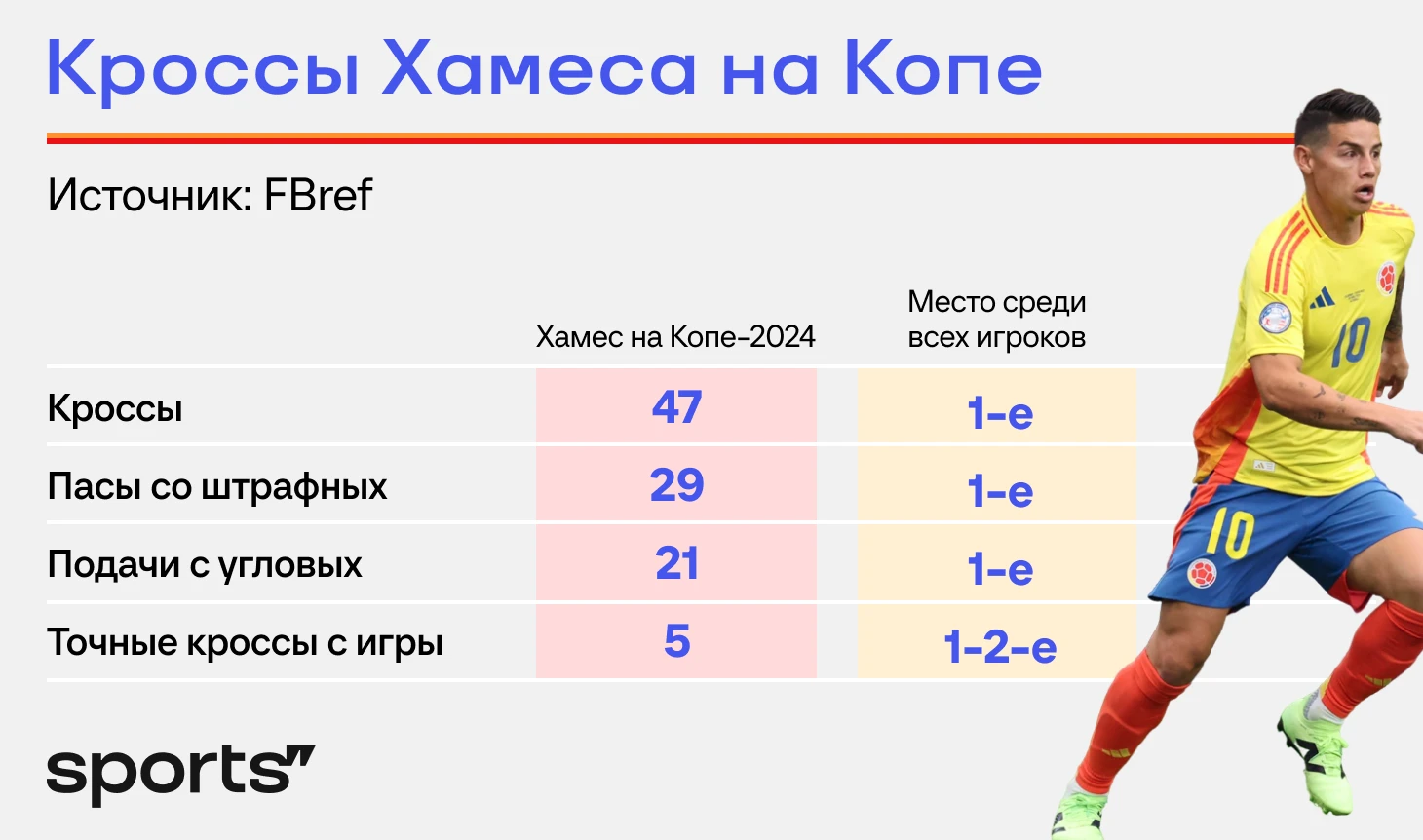 Сильно помогли и адресаты. В распоряжении Колумбии оказался массивный форвард «Краснодара» Джон Кордоба (с подачи Хамеса после углового забил Панаме) и опорник «Кристал Пэлас» Джефферсон Лерма (против Парагвая замкнул кросс Хамеса после штрафного, а в игре с Уругваем – после углового). Еще выделяется Давинсон Санчес из центра обороны – защитник «Галатасарая» на Копе нанес сразу семь ударов (столько же у Хамеса).