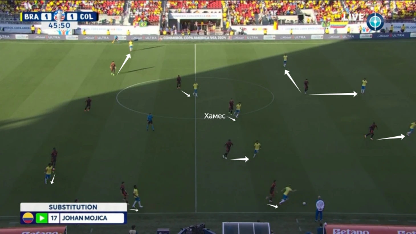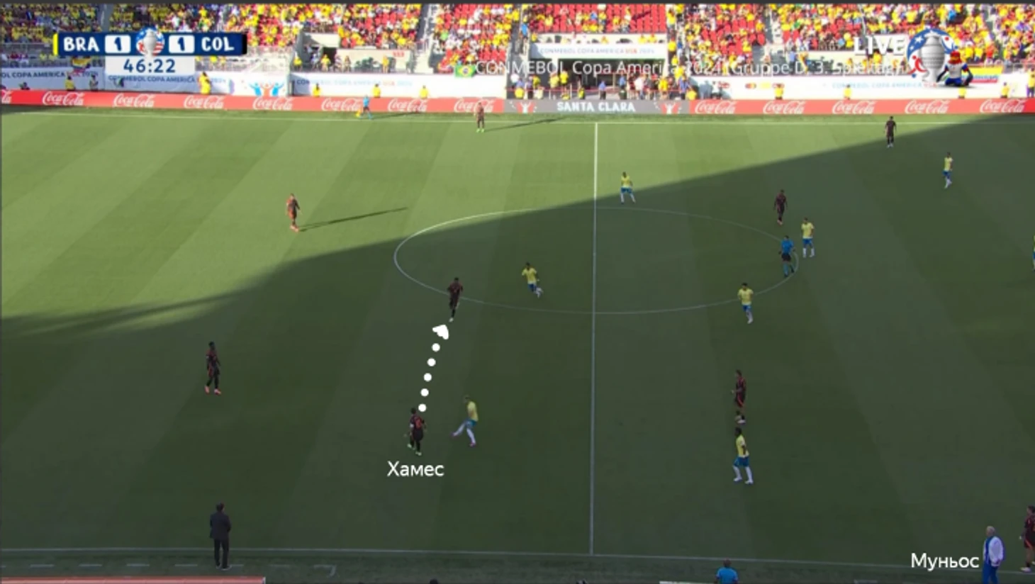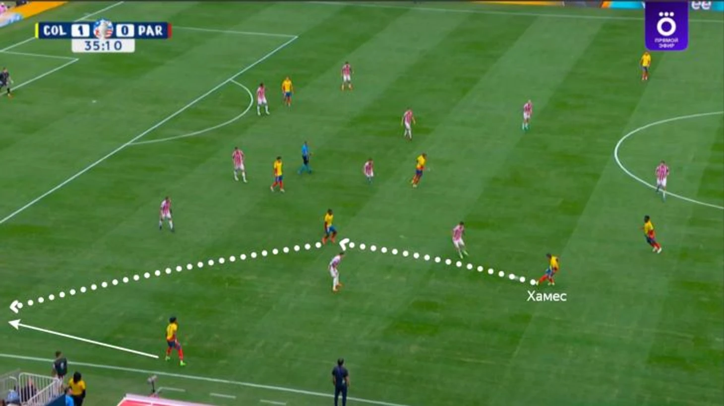 Третий козырь – уходы Хамеса в опорную зону. Иногда этот элемент рушил структуру. Но качественное продвижение мяча из глубины от Хамеса добавляло Колумбии атакующего разнообразия.