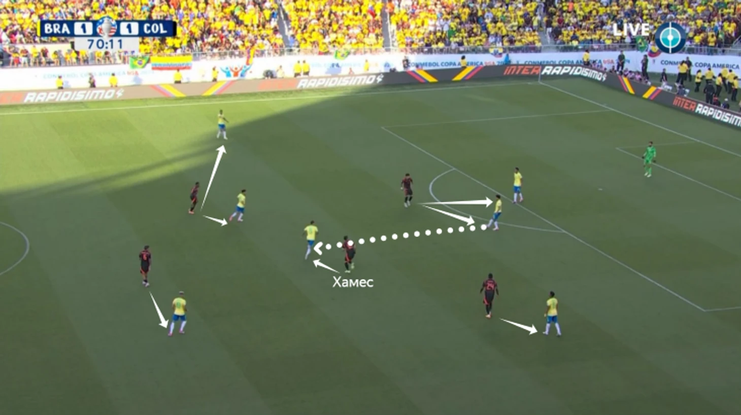В другом эпизоде Бразилия только что вернула мяч. Колумбия начинает прессинг и еще не находится в оптимальной формации, но тут важнее концентрация. Хамес рядом с Бруно Гимараэсом, но в итоге хавбек «Ньюкасла» свободно переводит на Данило правее.