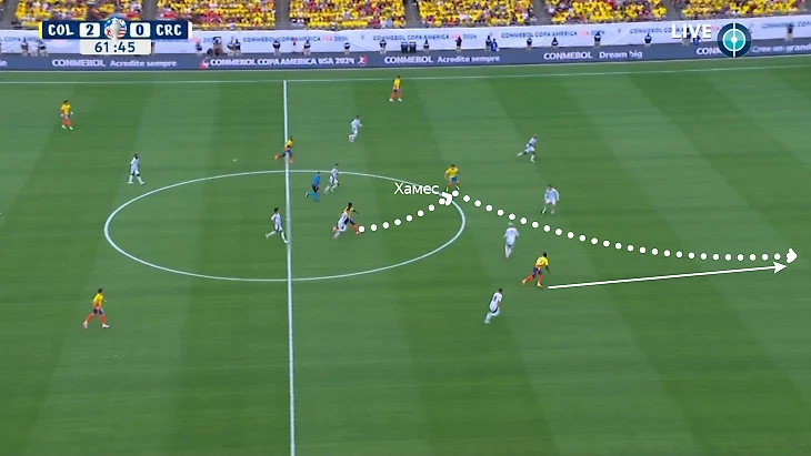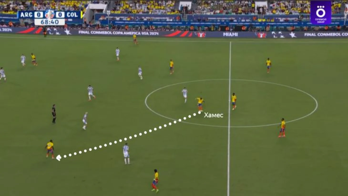 Проговорим еще раз: Хамес зажег на Копе благодаря трем сильным сторонам. Это эффективные кроссы (как с игры, так и со стандартов), умелый поиск свободы (постоянно находил зоны между линиями) и организация владения из опорной зоны (делала Колумбию вариативнее в построении атаки).