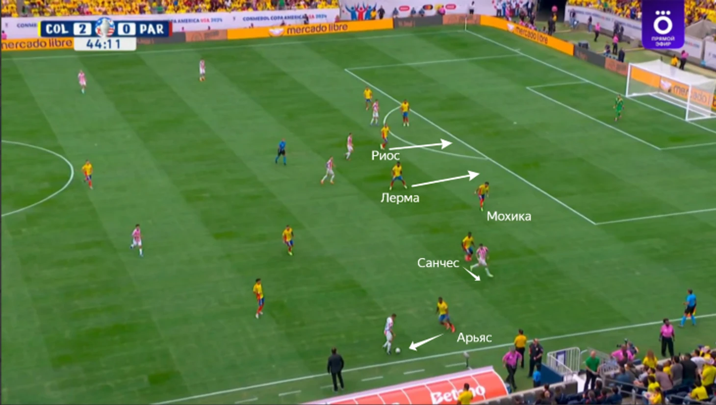 Ниже пример, когда неудачный прессинг Парагвая на фланге привел к огромным разрывам. Лерма увидел свободного Хамеса левее от опорника Андреса Кубаса – колумбиец протащил мяч вперед и выкатил Диасу под прострел.