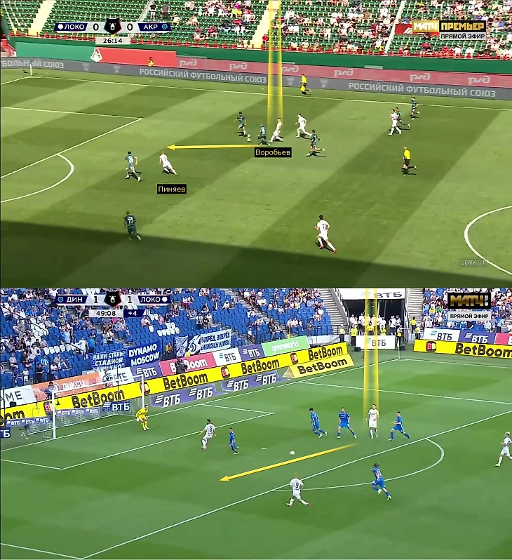Лидеры «Локо» прошлых сезонов не позволяли постоянно прессинговать. При Галактионове обозначали давление при розыгрышах от ворот соперника и раньше (лучший пример – гол Глушенкова «Зениту» весной 2023-го), но нынешний состав дисциплинированнее благодаря Воробьеву и адаптациям остальных (например, Ненахов и Сильянов агрессивны в своих зонах, опорники подстраиваются под полузащиту соперников).