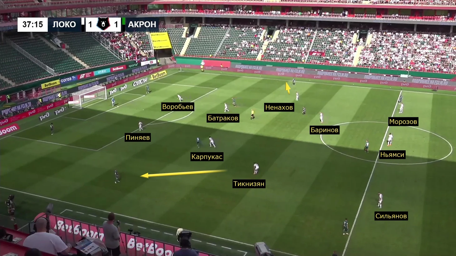 В итоге у «Локомотива» очень уязвим левый фланг, который некому качественно страховать. Если в оголенную зону смещается один из опорников, дыра образуется в середине поля. В центре обороны тоже грустно: Ньямси не так силен в единоборствах, номинальных фланговых защитников Ненахова и Сильянова тоже продавливают при забросах. У «Локомотива» нет хребта – в центре все очень хрупко.
