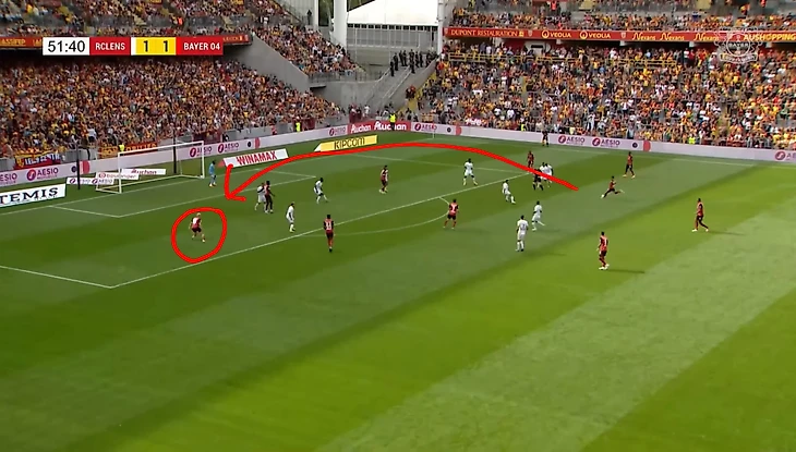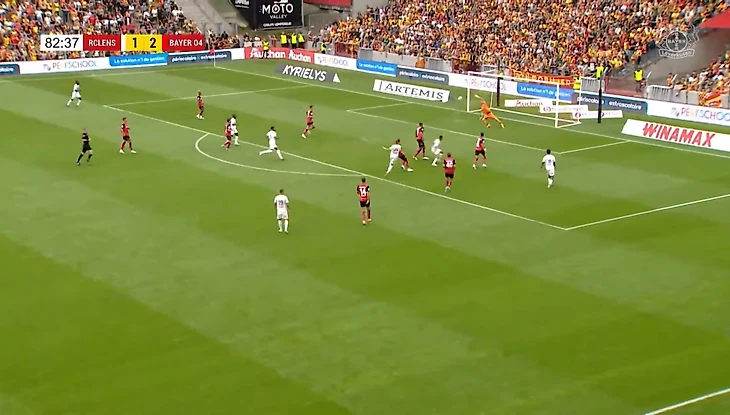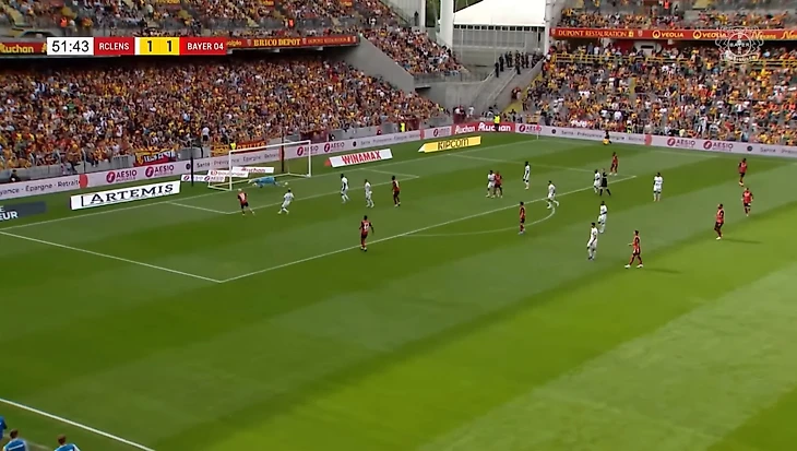 На 51-й минуте Виртц оторвался от защитника соперника (Агилар застрял в полупозиции, не разобравшись ни с Белосьяном, ни с Виртцем, которые находились рядом), и обводящим ударом замкнул навес Алеиша Гарсии. Счёт на табло стал 2:1 в пользу «Байера 04».