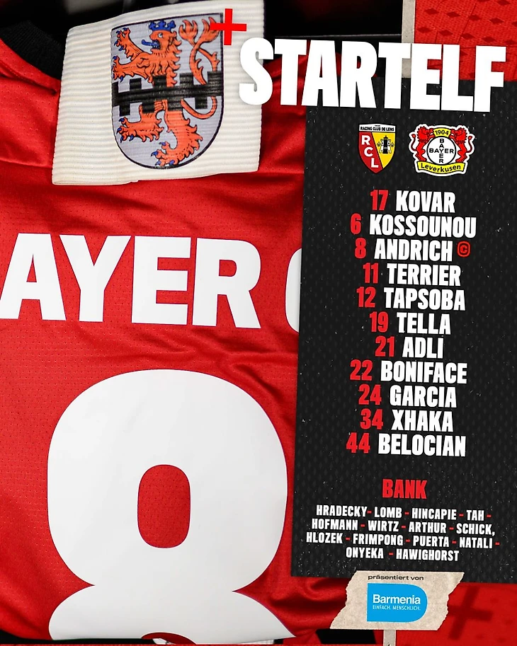 Хаби Алонсо изменил три позиции в стартовом составе по сравнению с победой над «Рот-Вайсс Эссеном». Матей Коварж занял место в воротах вместо Лукаша Градецкого, который остался на скамейке запасных. Гранит Джака и Роберт Андрих (немец играл на позиции центрального защитника в первом тайме, а Жанюэль Белосьян переместился на левый край) также вышли на поле, заменив Йонаса Хофманна и Артура.