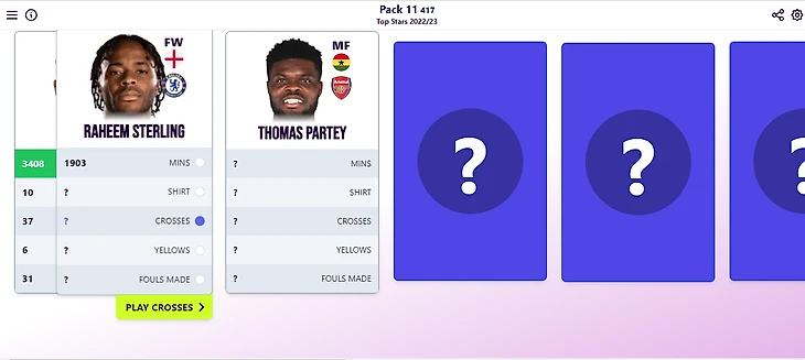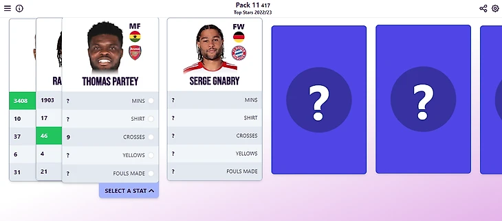 Pack 11 – Вам дается два игрока и 5 статистических метрик (например, минуты на поле, игровой номер, кроссы, желтые карточки и совершенные фолы). Нужно определить, какая из цифр первого игрока больше, чем у второго. Если вы оказались правы, то дается третий игрок, и теперь вы выбираете, какая цифра второго игрока больше, чем у третьего. Цель: пройти так 11 игроков, есть 1 право на ошибку.