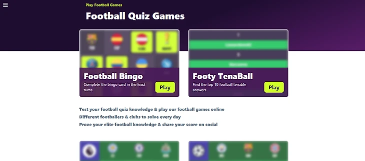 Football Bingo – даются 42 случайных игрока (предлагаются один за другим) и 16 случайных слотов бинго, куда их надо распределить по характеристикам. Время может быть ограничено (по 10 секунд на игрока), или нет -- по выбору. При ошибке (распределении игрока туда, куда он не подходит) количество оставшихся игроков уменьшается на два. Один раз за игру есть возможность использовать кнопку джокера: футболист, на котором она используется закрывает все возможные слоты, куда он подходит.