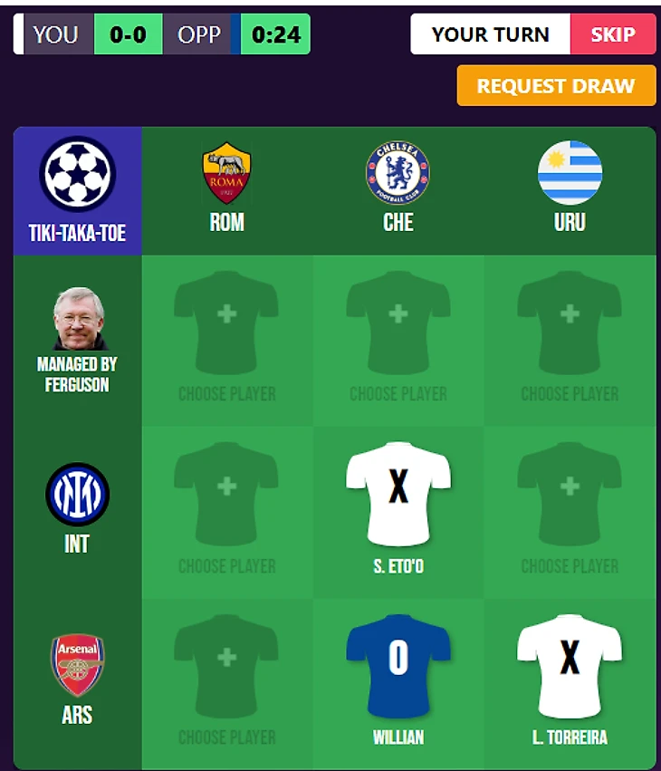 Tiki-Taka-Toe – футбольные крестики нолики. Правила такие же, как в обычной игре. Сверху и сбоку поля расположены клубы (и не только). Чтобы поставить крестик или нолик вам нужно нажать на место, куда хотите сделать ход, посмотреть пересечение клубов сверху и снизу, написать игрока, который играл в обоих этих клубах.