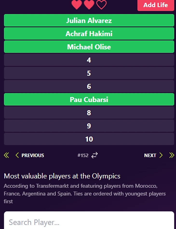 Footy Tenaball – Дается вопрос, например, назовите 10 самых дорогостоящих футболистов олимпиады. Ну и нужно называть. Есть 3 шанса на ошибку – три жизни.