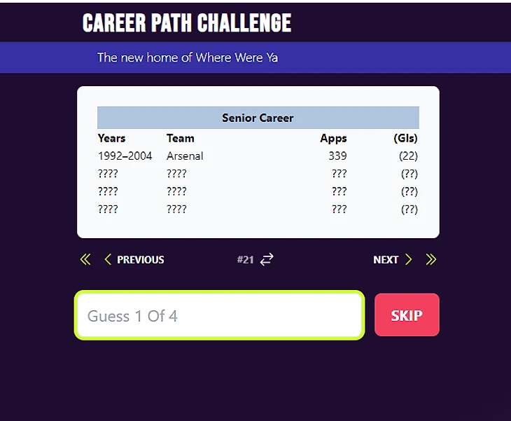 Career Path Challenge – недавно переработанная игра, раньше называлась Where were Ya. Суть с обновлением не поменялась: дается первый клуб игрока, задача: угадать футболиста. С каждой попыткой открывается следующий клуб, в котором был игрок. В качестве подсказок – период, проведенный в клубе, количество игр и голов.