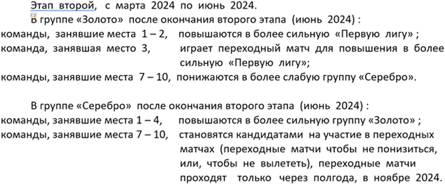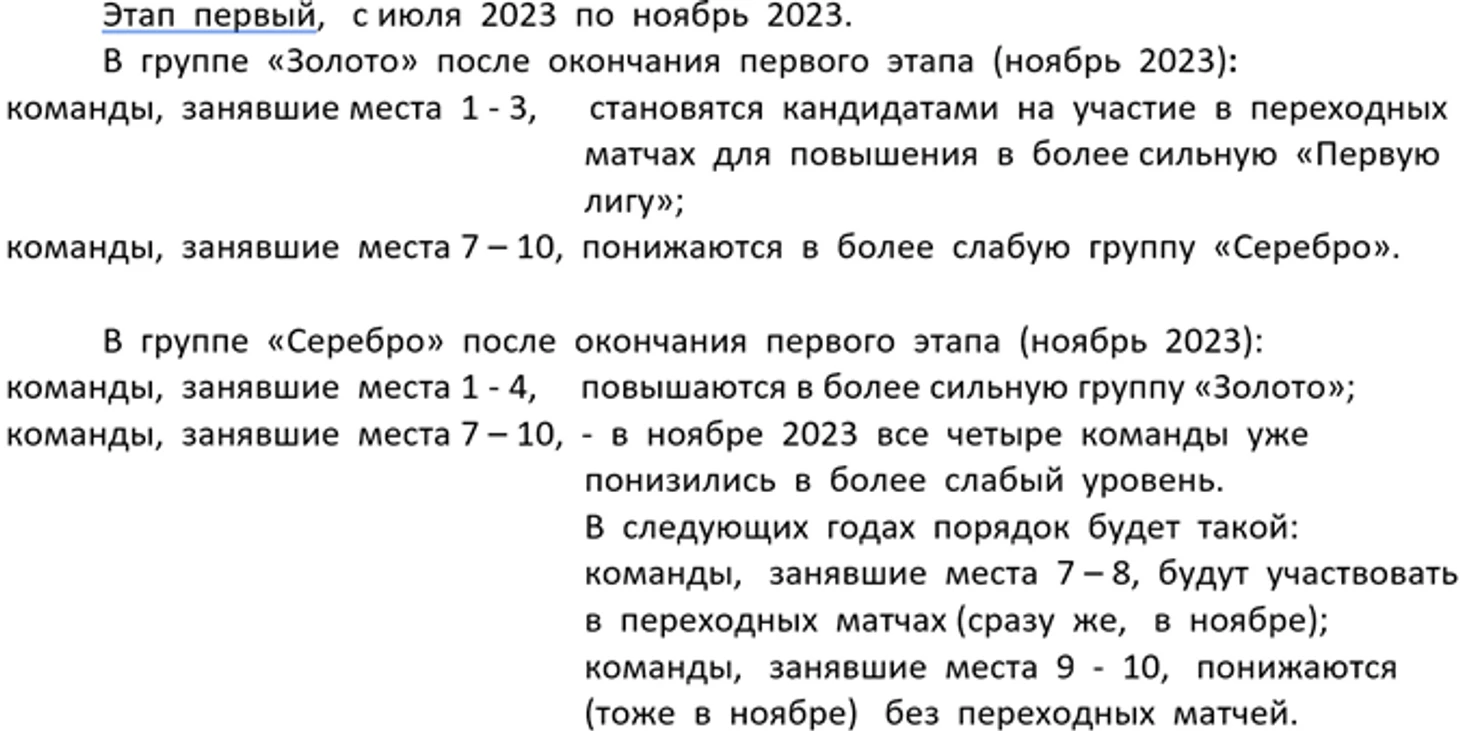 "Четвертое. Из группы «Серебро» за один игровой год (или за два этапа) понижаются в нижестоящий уровень четыре команды. Порядок процесса понижения следующий: вначале учитывается этап второй (март 2024 – июнь 2024), потом этап первый (июль 2024 – ноябрь 2024), сразу после окончания этапа первого (ноябрь 2024) проводятся переходные матчи (в переходных матчах проигравший понижается, а победитель не понижается, то есть, сохраняет место), и сразу после окончания переходных игр проводятся все четыре понижения."