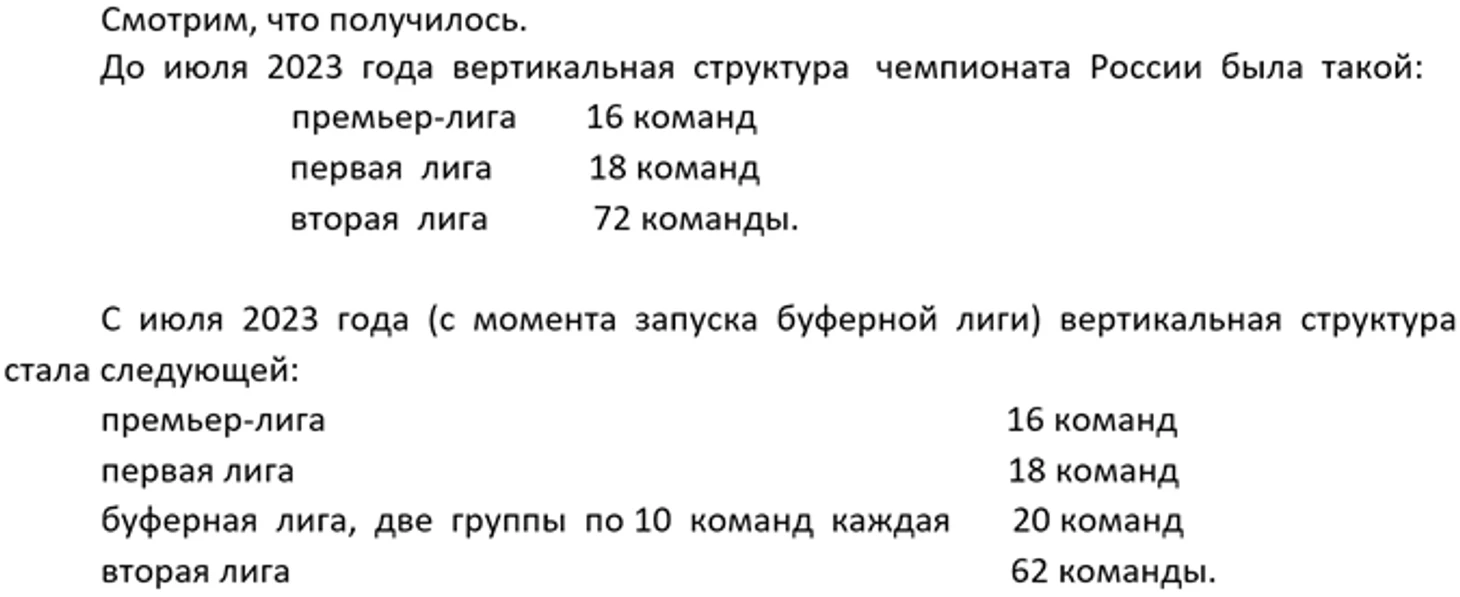 Наконец, для тех, кто ждал хорошие новости российского футбола, с июля 2023 года одну структурную часть чемпионата России стали проводить в зимнем календаре, другую структурную часть чемпионата – в летнем календаре, а для синхронизации двух разных календарей в структуру чемпионата России ввели синхронизирующий механизм – буферную лигу.
