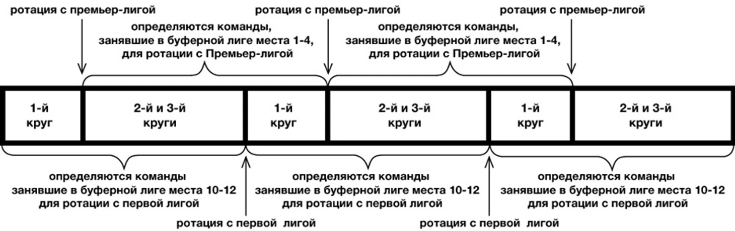 В верхней части схемы с помощью верхних стрелок показана ротация буферной лиги с премьер-лигой, в нижней части схемы с помощью нижних стрелок показана ротация буферной лиги с первой лигой. Верхняя ротация синхронизирована с календарем премьер-лиги, нижняя ротация синхронизирована с календарем первой лиги. На схеме видно, что, ротация буферной лиги с премьер-лигой и ротация буферной лиги с первой лигой проходят в разное время.