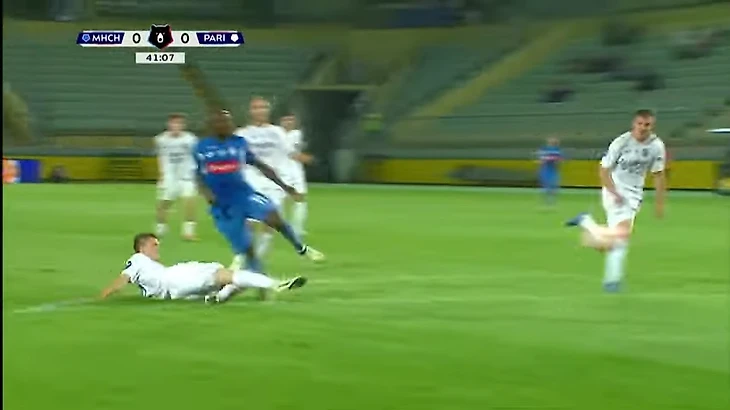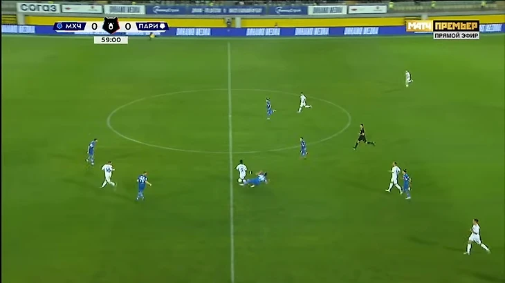 Следующий скрин: игрок Пари НН вместе с ударом по ноге Касинтуре выбивает мяч в пределах штрафной: