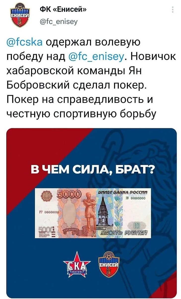 Но хватит предисловий - обратимся к простому перечислению «отрубания голов дракона» Первая из широко известных случилась в августе 2021 в игре СКА (Хабаровск) - Енисей в ФНЛ. Пострадавший Енисей в соцсетях написал следующее: