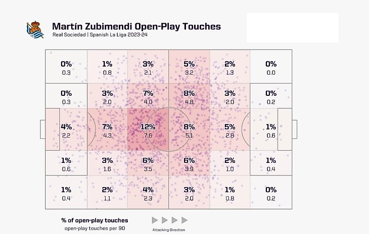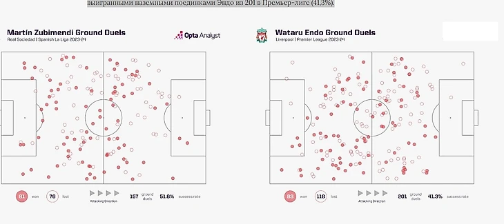 Это показывает, насколько может быть Зубаменди в обороне. Он не агрессивный опорный полузащитник в стиле Хавьера Маскерано, но он делает достаточно для своего клуба, чтобы сломить игру соперника. Как вы можете наблюдать, он выиграл 81 из 157 наземных поединков в Ла Лиге в 2023-24 годах (51,6%) по сравнению с 83 выигранными наземными поединками Эндо из 201 в Премьер-лиге (41,3%). В конечном счете – и это, вероятно, не то, что мы должны признавать в статье, анализирующей его данные, – но Зубименди, возможно, относится к тому типу игроков, о которых нельзя судить по цифрам, как это было в какой-то степени в случае с Бускетсом.