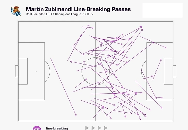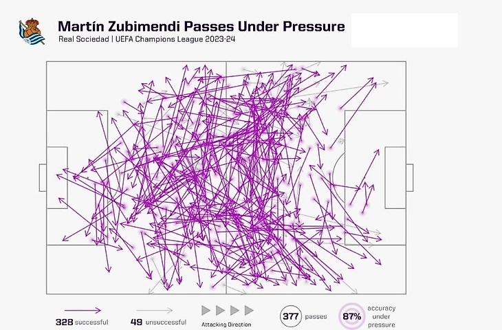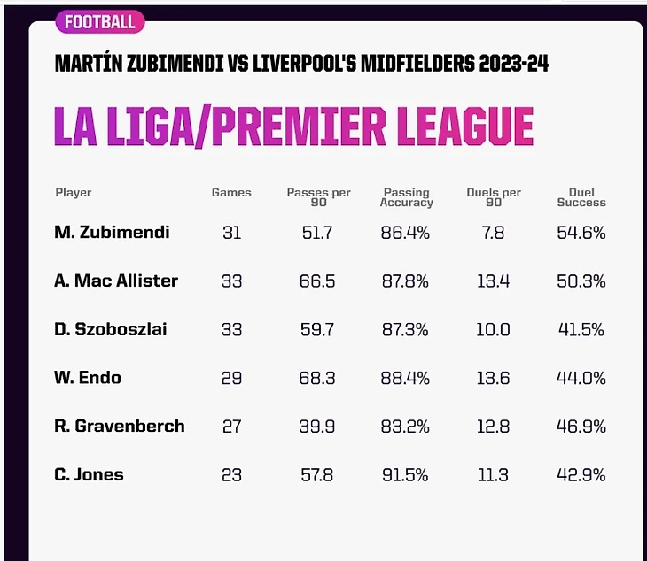 По сравнению с основным вариантом полузащиты «Ливерпуля» в прошлом сезоне. Зубименди добился больших успехов в дуэли — 54%, при этом Макаллистер — единственный полузащитник, который завершил свою кампанию с успехом более чем 50%. Между тем, только Гравенберх отдавал в среднем меньше передач и отличался меньшей точностью, но голландец в основном играл на более продвинутой позиции слева от тройки полузащитников.