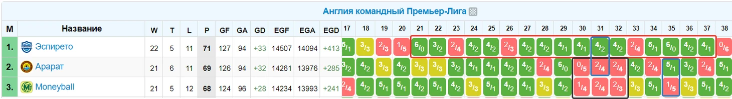 С 30-го по 32-ой тур сразу оба оппонента выдали 3-ех матчевую серию поражений, чем мы сполна воспользовались. Не обошлось и без нашего участия: в 31-ом туре в упорной борьбе покорили Арарат со счетом 4:2. На отрезке с 21-го по 37-й туры в 17-ти играх было одержано 14 побед! В итоге в 37-ом туре, обыграв команду 4-4-2, Эспирето обеспечила себе титул в АПЛ за тур до конца чемпионата. Уже 2-ой в этом турнире за 3 года!