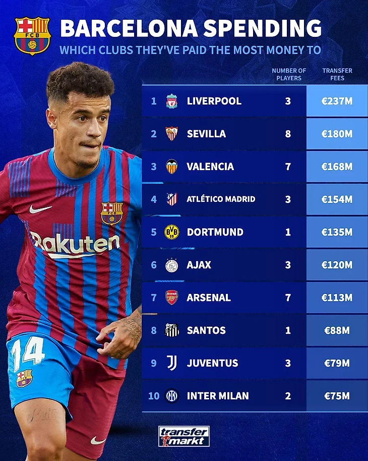 Первое место с заметным отрывом занял «Ливерпуль», у которого каталонцы приобрели всего трех игроков, но на сумму в 237 млн евро − Фелиппе Коутиньо (90 млн), Луис Суарес (52 млн) и Хавьер Маскерано (26 млн).