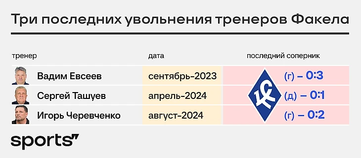 Александр Дорский отметил: это уже пятая отставка из «Факела» за 64 тура в РПЛ – с сезона-2022/23 ни один другой клуб лиги не расстается с тренерами так часто. Четыре увольнения было у «Химок», три – у «Пари НН» и «Ахмата». Ранее «Факел» помимо Черевченко, Ташуева и Евсеева покидали Олег Василенко и Дмитрий Пятибратов.