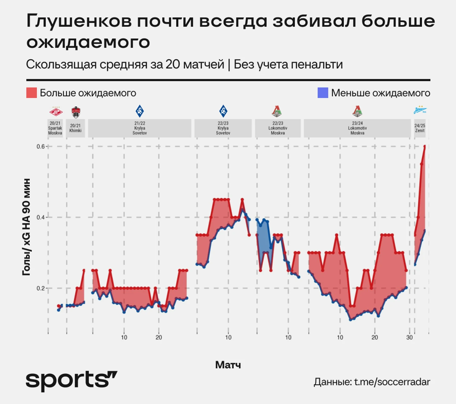 Конечно, наиболее реален второй сценарий. Скорее всего, на дистанции Глушенков не получит таких качественных моментов – даже суперзвезды прошлых сезонов не превышали 0,5-0,7 xG за 90 минут. Уровень реализации тоже должен упасть.