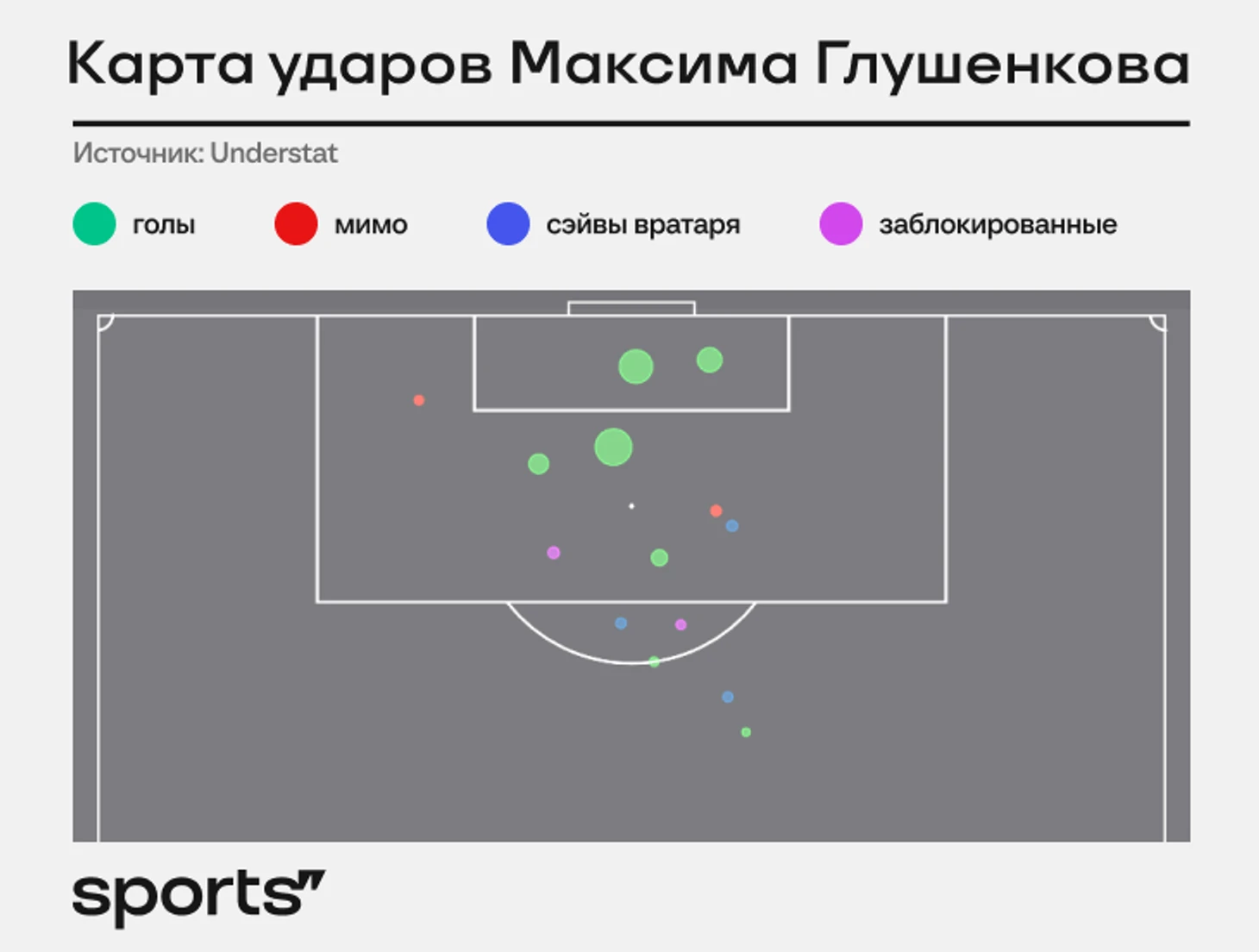 Глушенкову для 7 голов понадобилось всего 14 ударов ценностью в 3,5 xG. Самый космический матч – с «Ростовом» (5:0), когда Глушенков оформил хет-трик тремя ударами, два из которых Макс нанес из-за штрафной.