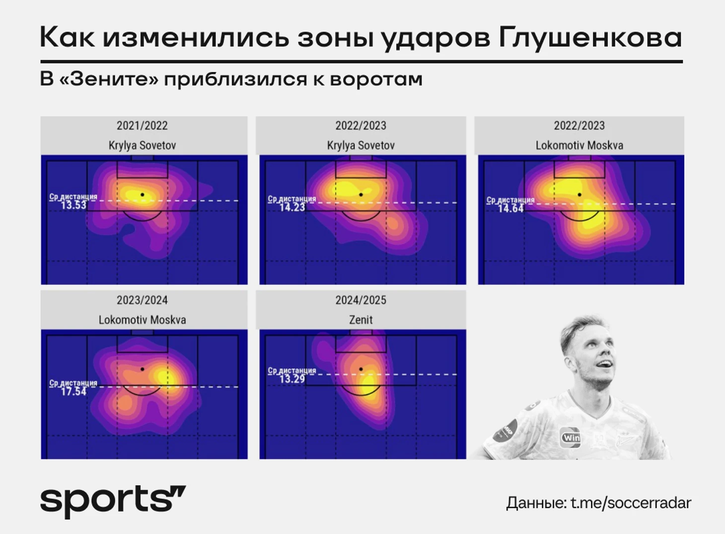 Благодаря этому Глушенков бьет из створа ворот чаще, чем когда-либо в РПЛ.