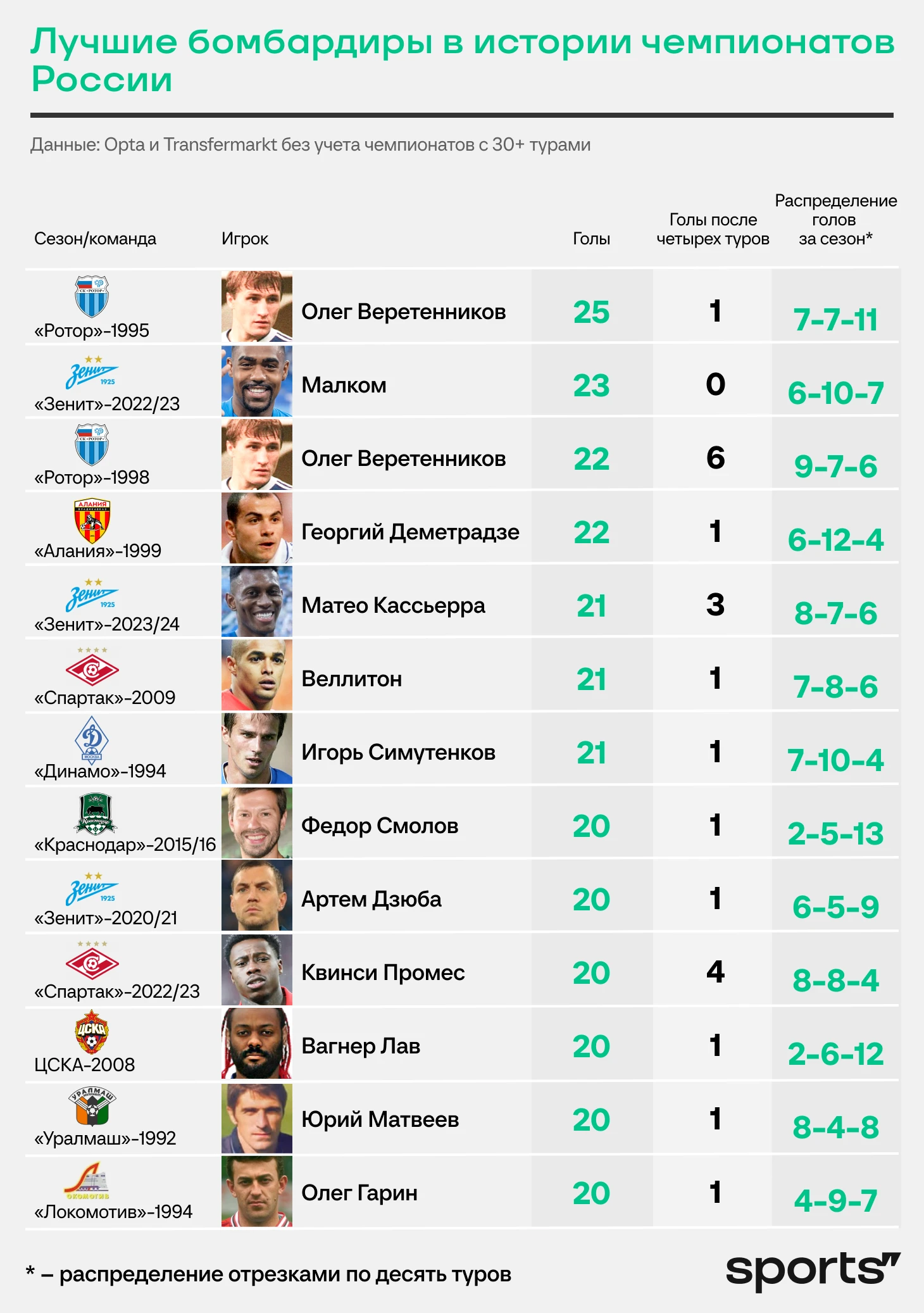 Удивительно, но многие супербомбардиры молчали на старте: Малком, забивший 23 гола в сезоне-2022/23, ни разу не забил, но все равно обогнал Квинси Промеса (наоборот – четыре гола в начале чемпионате), большинство забило по одному мячу.
