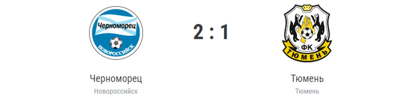 Голы: Уридия, 20 (1:0). Антонов, 79 (2:0). Кенфак, 87 (2:1). Нереализованный пенальти: Коротаев, 40 (вратарь). «Черноморец» (Новороссийск): Фролкин, Мусалов (Безчаснюк, 65), Стежко, Чичинадзе, Хабалов (Красильниченко, 46), Ланин, Енин, Иванов, Родионов, Уридия (Окладников, 79), Кротов (Антонов, 46. Кумбурович, 90+3). «Тюмень»: Савин, Бем (Петров, 82), Сухорученко, Шавлохов, Воропаев, Ткачук,Талалай (Купцов, 82), Кенфак, Кленкин, Коротаев (Кулишев, 64), Карпов. Наказания: Шавлохов, 13. Енин, 58. Кенфак, 90+5. Шавлохов, 90+6 (предупреждения). Судья: Целовальников (Астрахань). 18 августа. Новороссийск. Стадион «Центральный». 5312 зрителей.