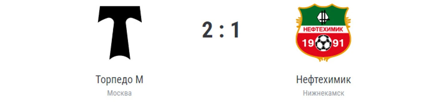 Голы: Петров, 30 (0:1). Корян, 32 (1:1). Манелов, 35 (2:1). «Торпедо» (Москва): Бабурин, Шевченко, Иваньков, Бородин, Роганович, Чурич, Нетфуллин, Галкин (Горбунов, 63), Корян (Шамкин, 64. Апонса, 76), Манелов (Лебеденко, 90+1), Чупаев (Червяков, 76). «Нефтехимик» (Нижнекамск): Янович, Кахидзе (Валиахметов, 65), Шоркин (Толстопятов, 80), Сагуткин, Ситдиков, Петров, Родин (Шарифуллин, 80), Шильцов (Магомедов, 78), Емельянов (Морозов, 65), Джамилов, Алиев. Наказания: Иваньков, 32. Ситдиков, 39. Шоркин, 46. Шильцов, 55. Петров, 90 (предупреждения). Судья: Соколов (Воронеж). 17 августа. Москва. Стадион «Лужники». 4942 зрителя.