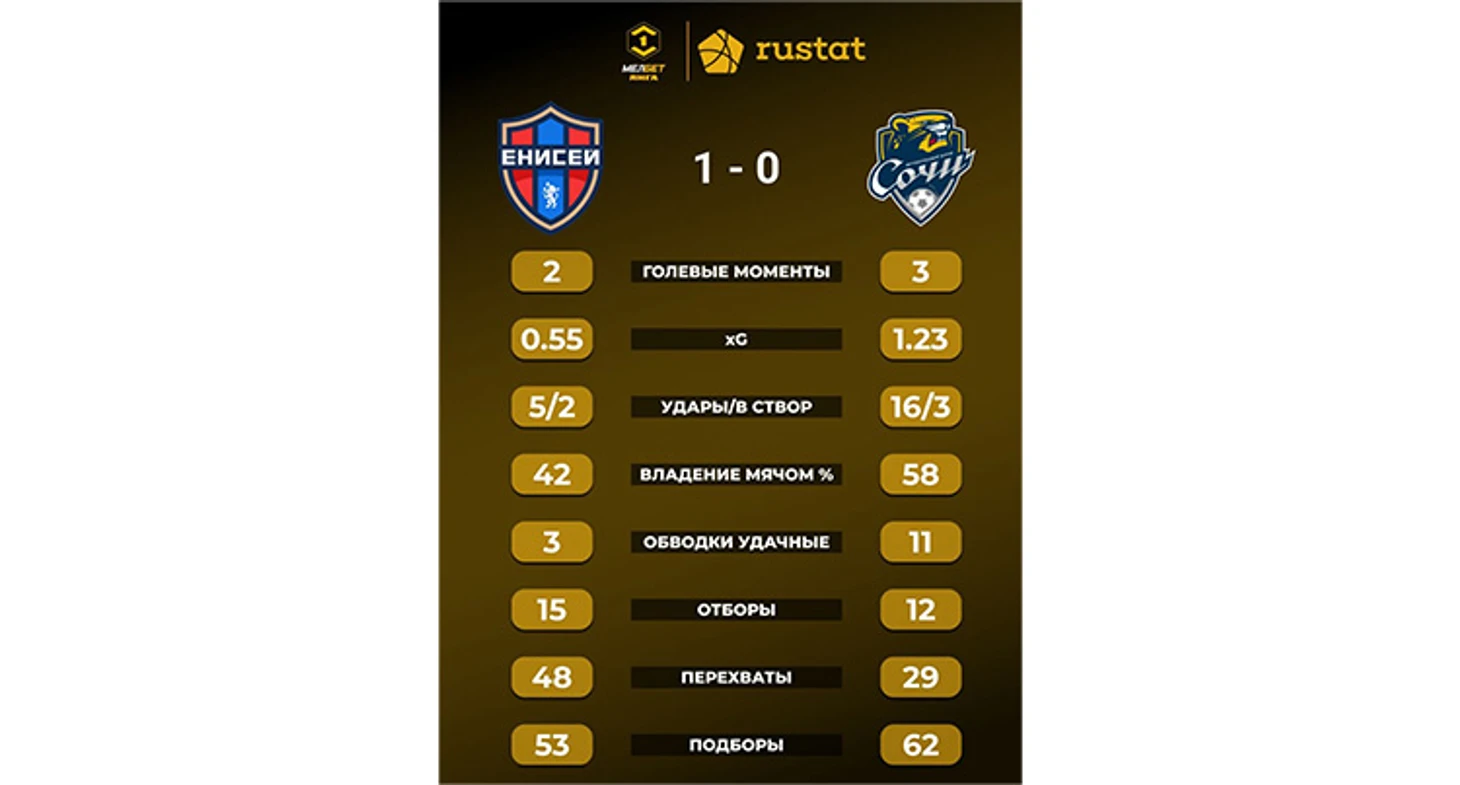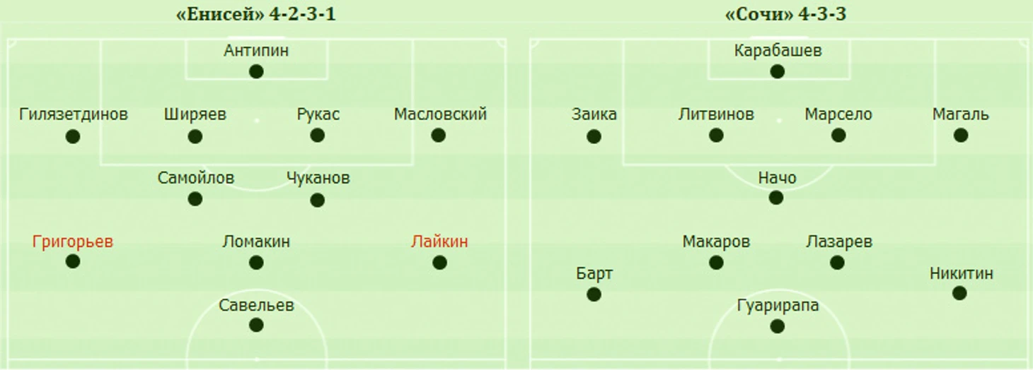 «Енисей» активно провёл стартовый отрезок матча, буквально зажав соперника на его половине поля. План хозяев сработал, и на 11-й минуте случился быстрый гол. Ломакин подал корнер с левого фланга на дальнюю штангу, Чуканов головой вернул мяч в центр, а Савельев также головой переправил его в сетку. После этого команда Андрея Тихонова отдала инициативу сопернику, который много владел мячом, но ничего опасного создать не сумел. Разве что центральный защитник сочинцев Марсело едва не подрезал мяч в дальний угол, откликнувшись на подачу со стандарта.