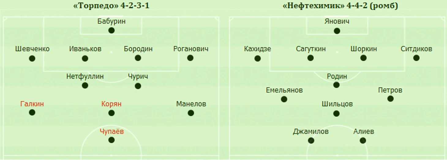 Хозяева немедленно встрепенулись и один за другим забили гостям два очень похожих гола. Оба раза с правого фланга подавал в штрафную защитник «Торпедо» Шевченко. В первом случае мяч от головы кого-то из нижнекамцев упал прямо на ногу торпедовцу Коряну, и тот, не растерявшись, сильно пробил с лета. А затем подправить мяч в сетку пяткой пытался нападающий хозяев Чупаёв. Это у него не получилось, однако мяч прокатился дальше, где один перед пустым углом ворот находился торпедовец Манелов.