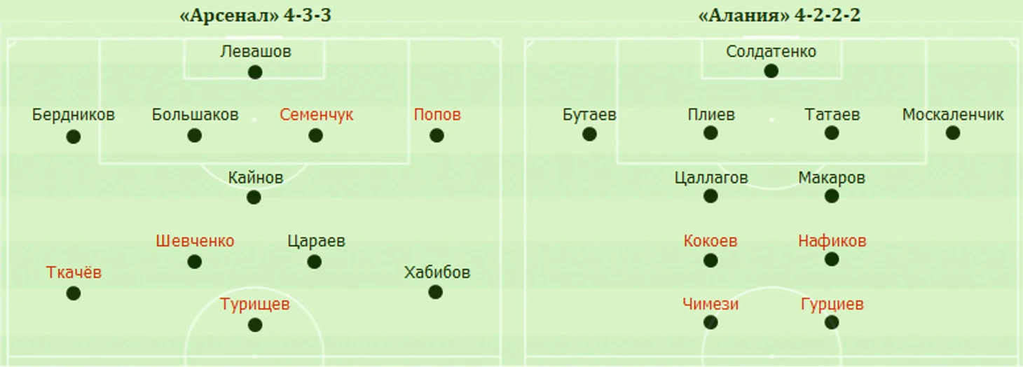 «Арсенал» (Тула): Левашов, Бердников (Минаев, 81), Семенчук, Большаков, Попов, Кайнов, Ткачев (Гелоян, 66), Цараев (Раздорских, 70), Шевченко, Хабибов (Коротков, 66), Турищев (Азявин, 46). «Алания» (Владикавказ): Солдатенко, Бутаев, Татаев, Плиев, Москаленчик (Губиев, 76), Макаров (Хугаев, 76), Цаллагов, Кокоев (Тарба, 59), Нафиков (Чочиев, 59), Уильямс, Гурциев (Багаев, 81). Наказания: Плиев, 15. Цаллагов, 43. Семенчук, 79. Хугаев, 87 (предупреждения). Плиев, 80 (удаление). Судья: Жабченко (Краснодар). 17 августа. Тула. Стадион «Арсенал». 4242 зрителя.