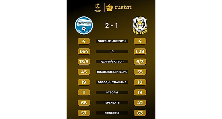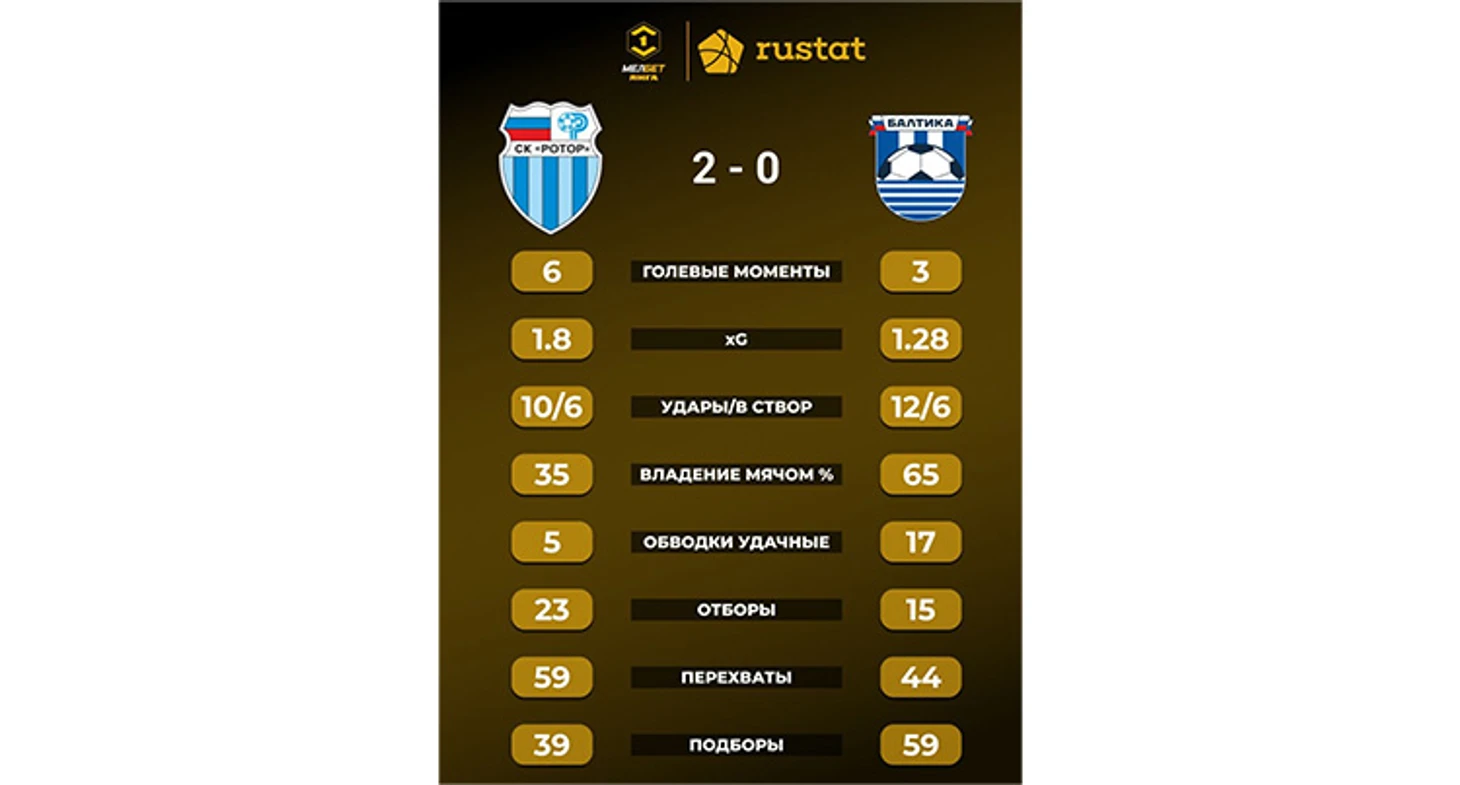 Преимущество калининградцев во владении было подавляющим. Однако незадолго до финального свистка, когда «Балтика» увлеклась атакой, «Ротору» удался контрвыпад два в два. Прорвавшийся по правому полуфлангу Шильников пробил в ближнюю стойку, защитник гостей Андраде толком не попал по отскочившему от неё мячу, и форвард хозяев Кухарчук поставил победную точку.