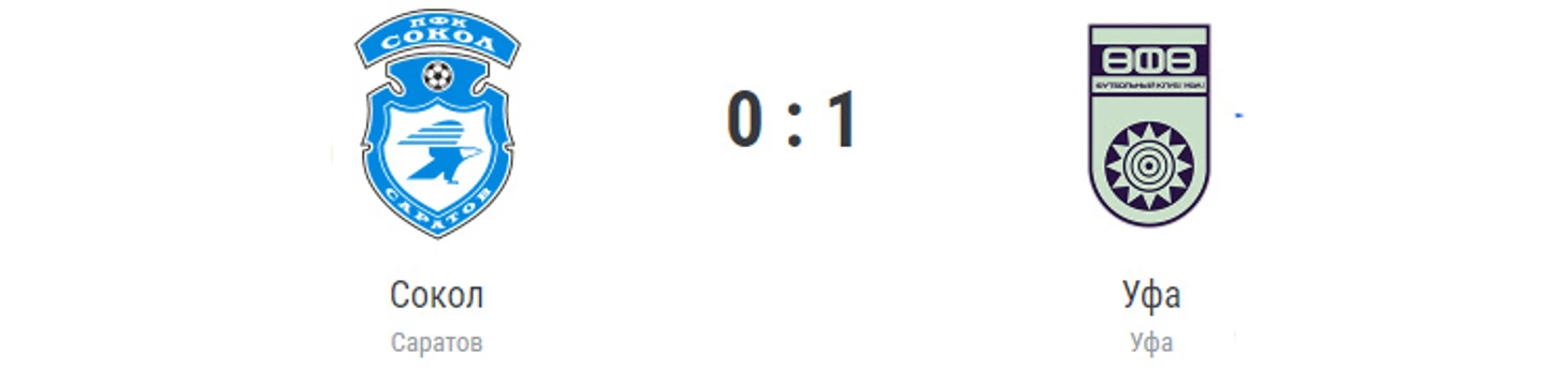 Гол: Анисимов, 34. «Сокол» (Саратов): Косаревский, Дудиев (Молодцов, 46), Иванов, Забелин, Синяк, Гуз (Ермолин, 58), Сасин (Шпитальный, 76), Полубояринов (Саадуев, 46), Чобанов, Карпицкий (Чуриков, 58), Максименко. «Уфа»: Баклов, Карпов, Захаров, Кутин, Перченок, Анисимов, Агеян (Шаваев, 77), Мацхарашвили (Гараев, 66), Адаев (Гыстаров, 77), Пасевич (Озманов, 85), Ложкин (Гуренко, 66). Наказания: Полубояринов, 18. Иванов, 29. Баклов, 87. Синяк, 89. Агеян, 90. Озманов, 90. Перченок, 90+2 (предупреждения). Судья: Матвеев (Троицк). 18 августа. Саратов. Стадион «Локомотив». 5250 зрителей.