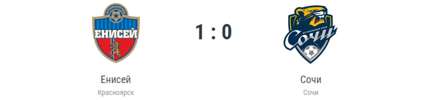 Гол: Савельев, 11. «Енисей» (Красноярск): Антипин, Гилязетдинов, Ширяев, Рукас, Масловский (Денисов, 85), Самойлов, Григорьев (Мазурин, 80), Ломакин, Чуканов, Лайкин (Богатырев, 72), Савельев (Молтенинов, 72). «Сочи»: Карабашев, Заика, Марсело Алвес, Литвинов, Магаль (Макарчук, 75), Макаров (Левин, 79), Начо, Лазарев (Крамарич, 46), Барт (Сафронов, 55), Гуарирапа, Никитин (Писарский, 46). Наказания: Ширяев, 23. Григорьев, 29. Заика, 51. Савельев, 68. Сааведра, 69. Гилязетдинов, 75 (предупреждения). Заика, 90 (удаление). Судья: Силантьев (Самара). 18 августа. Красноярск. Стадион «Центральный». 4816 зрителей.