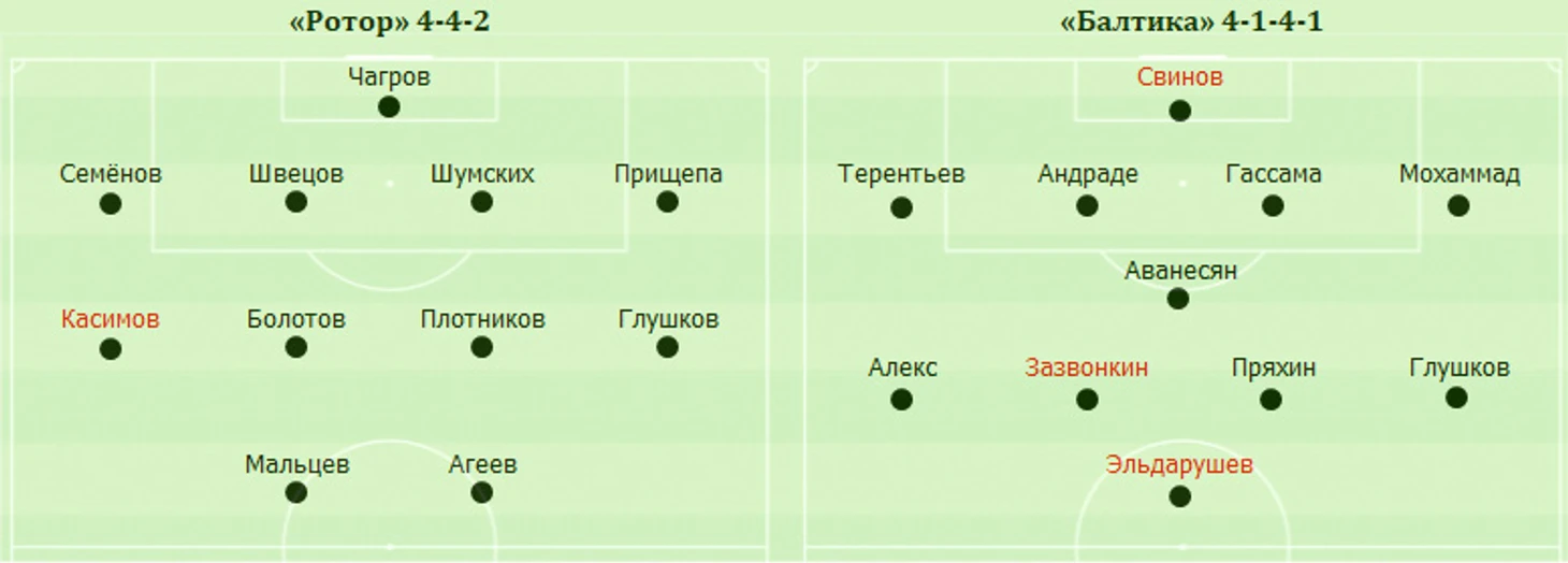 Едва стартовал второй тайм, как красную карточку за атаку соперника прямой ногой с выставленными наперевес шипами получил нападающий «Ротора» Мальцев. Оставшись вдесятером, хозяева сели в оборону, а гости обложили их штрафную и пытались сравнять результат. Иногда мяч находился в опасной близости от владений Чагрова, но до точного удара у балтийцев так и не дошло.