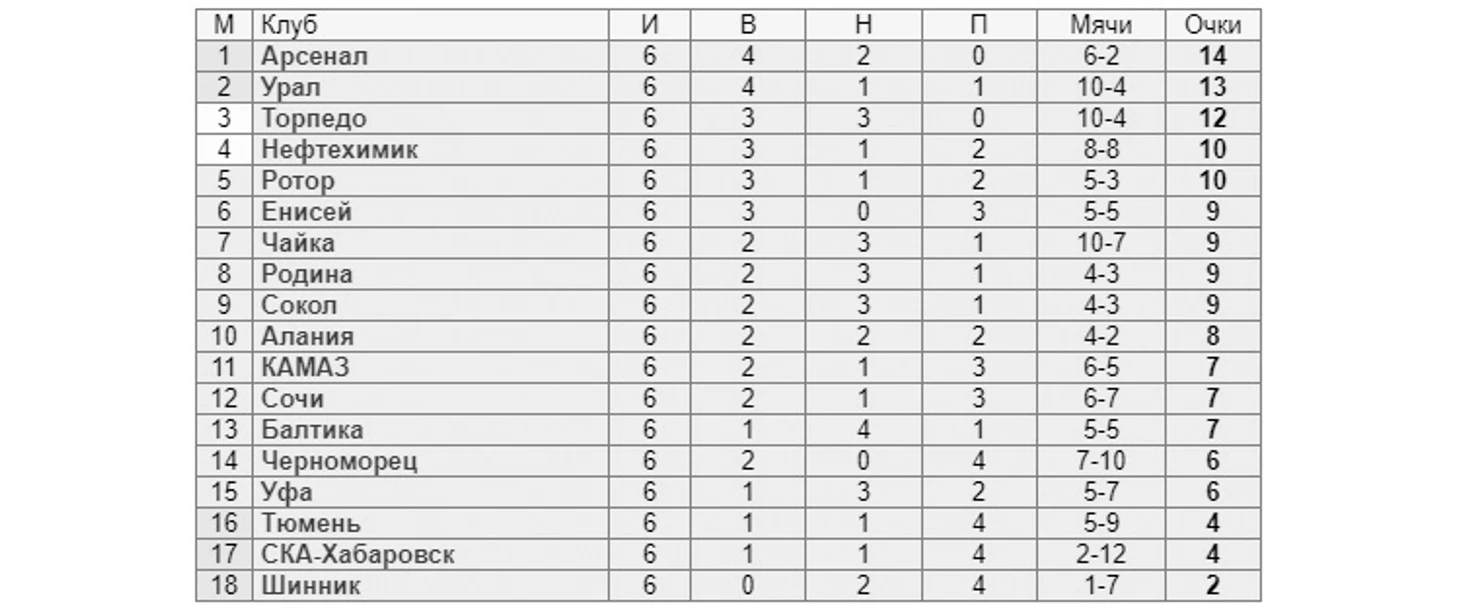 Первенство Первой лиги набирает ход. После шести проведённых туров в тройку лидеров входят тульский «Арсенал», «Урал» и московское «Торпедо». А вот вылетевшие в ФНЛ из Премьер-лиги «Балтика» и «Сочи» увязли в нижней половине таблицы.