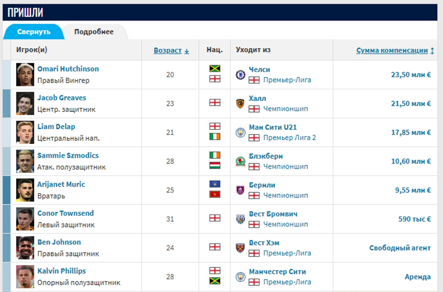 Трансферная компания Ипсвича на данный момент. Источник: www.transfermarkt.world