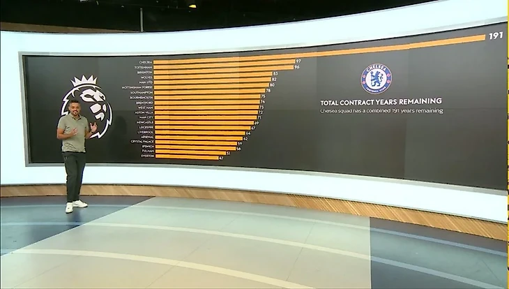 Британский Sky Sports в очередной раз не смог обойтись без стеба над лондонским «Челси». В эфире аналитической программы показали графику, которая называется «Оставшееся количество лет по контрактам». Неудивительно, что этот рейтинг с громадным отрывом возглавили «синие».