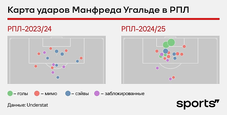 Угальде за 13 миллионов евро – в топ-3 дорогих трансферов «Спартака». За весну ни разу не забил в РПЛ и набрал меньше одного ожидаемого гола за 790 минут, хотя подходы были. За стартовые полгода Угальде нанес всего 16 ударов в 12 матчах (7 – из-за штрафной), глубоко выбрасывался за мячом и периодически задвигался налево.