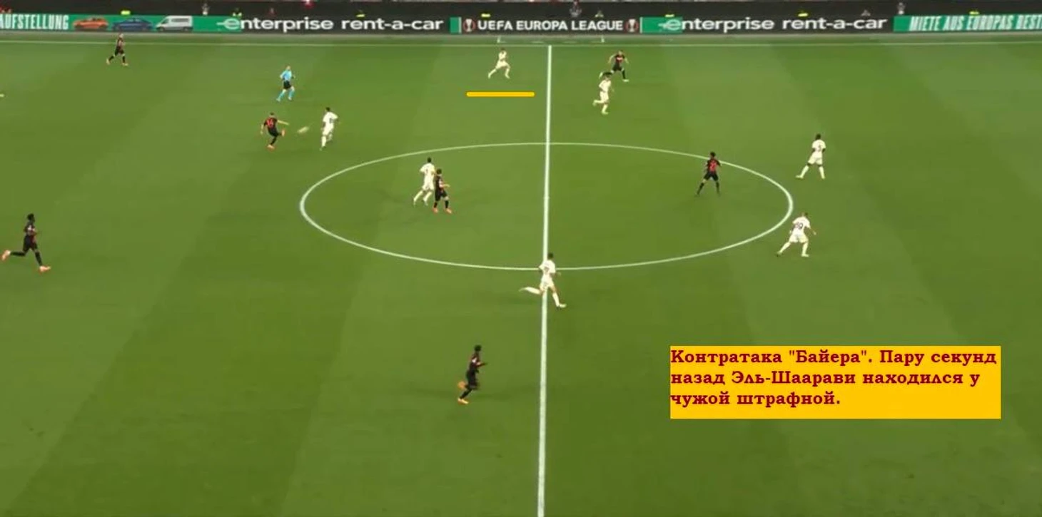 В следующий раз Де Росси использовал тактическую универсальность Эль-Шаарави в ответной игре против «Байера» в 1/2 ЛЕ. Перешел на тройку ЦЗ и выпустил Стефана правого латераля ликвидировать угрозу в лице Алекса Гримальдо. Итальянец снова неплохо проявил себя – дисциплинированные действия в переходных фазах без мяча, большие объемы работы, хорошее чтение и понимание эпизодов при обороне – краткое описание его игры.