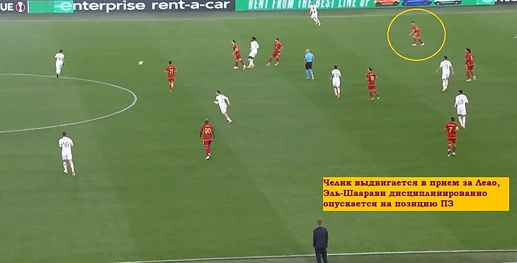 В ответной игре ситуация с распределением ролей в обороне могла меняться, Челик плотно доигрывал за Леау, персонально опускался за ним даже в глубину. Эль-Шаарави дисциплинированного заполнял зону правого защитника.