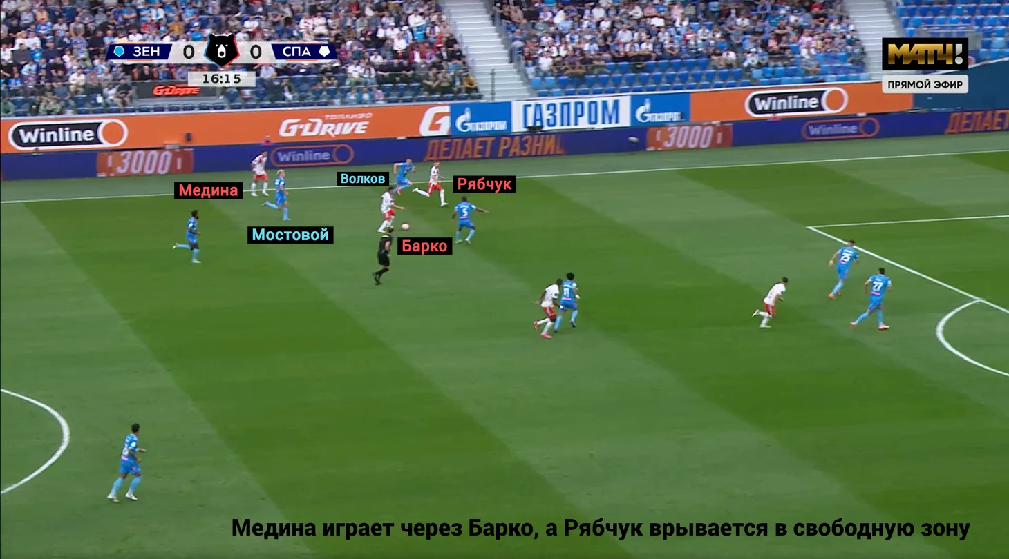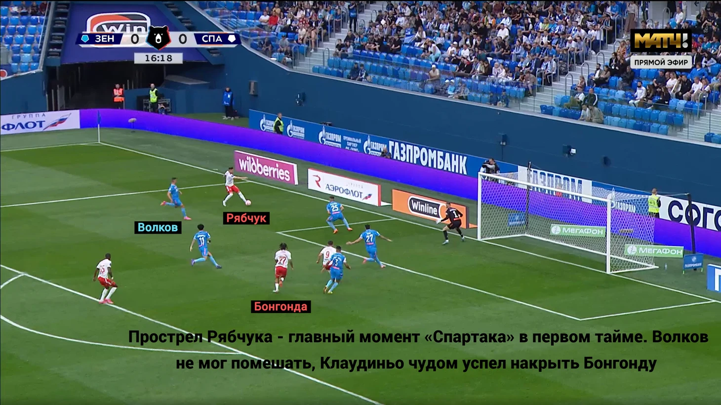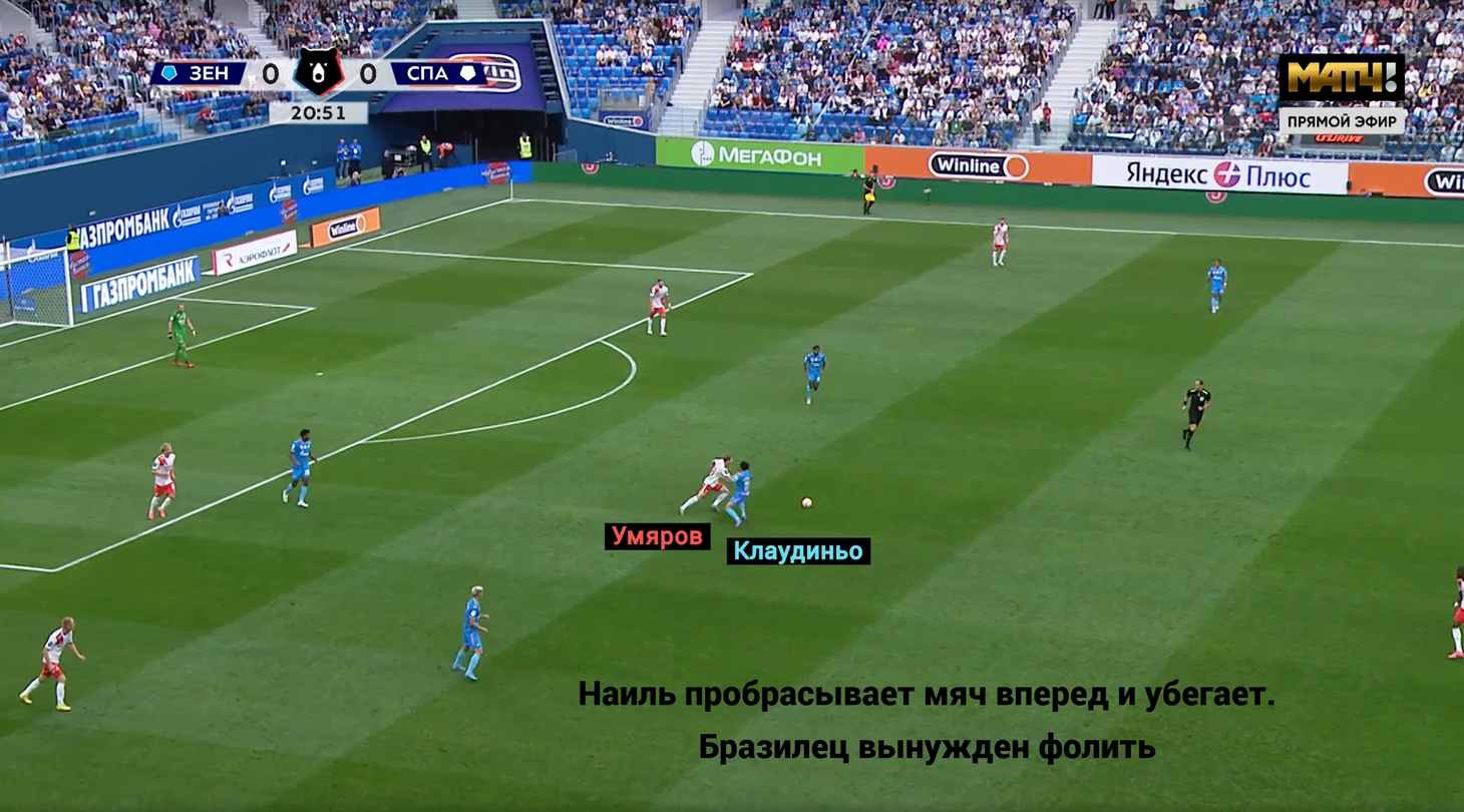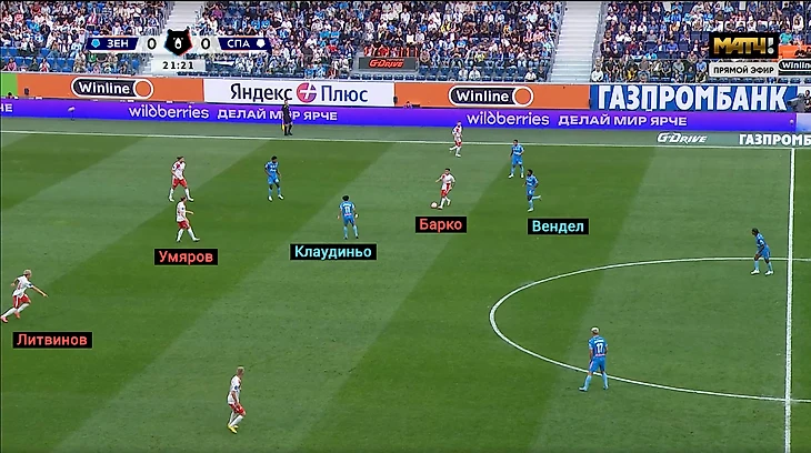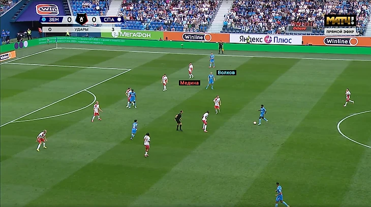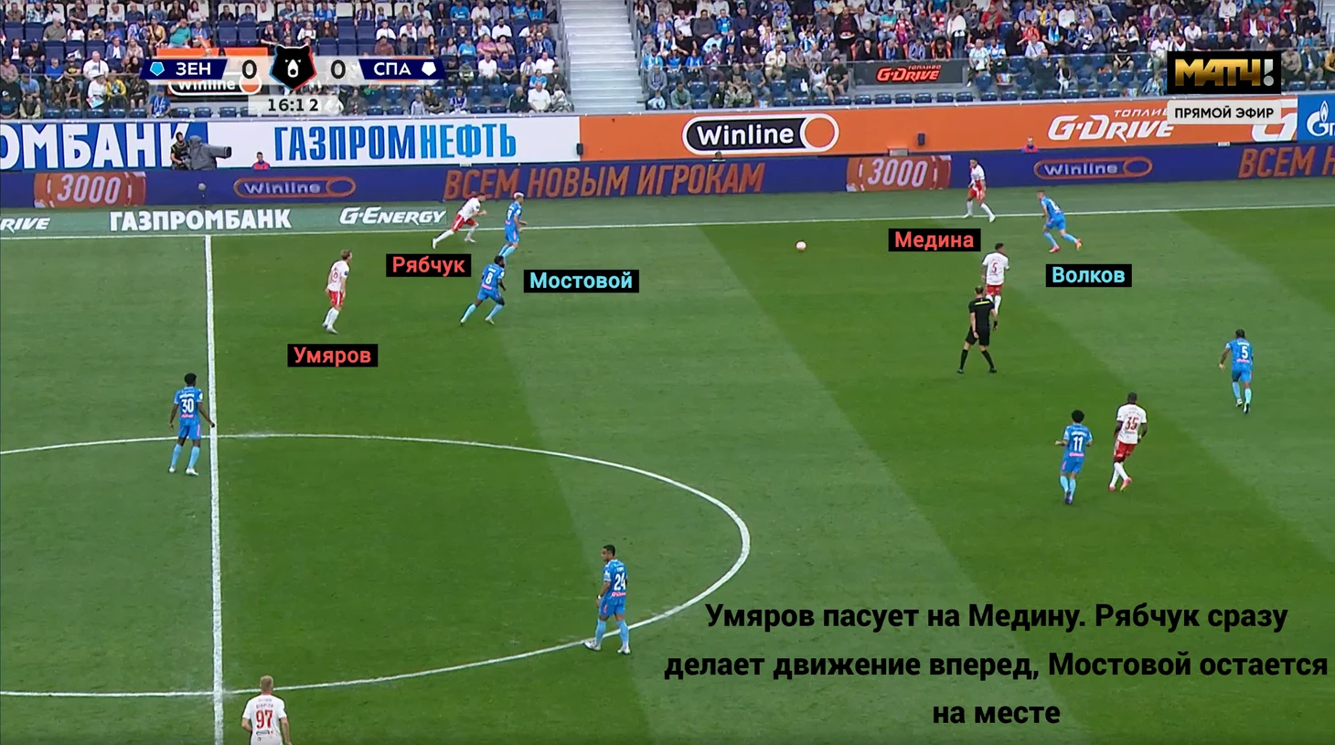 По ходу первого тайма Станкович снял с игры Мартинса. Чем была вызвана эта замена, не совсем понятно. Зобнин вышел строго по позиции и играл ту же роль. Единственная версия, связанная с тактикой – банальная боязнь удаления. Мартинс уже был на желтой. «Зенит» часто вытягивал соперника в прессинг, а выходил лучше всего через левый фланг и связку Сантоса с Клаудиньо.