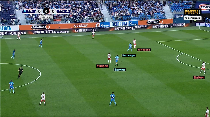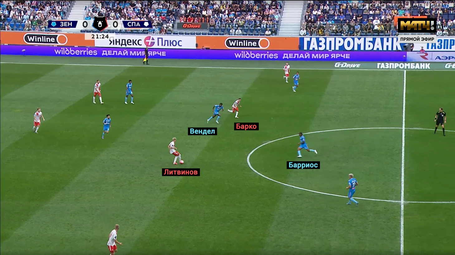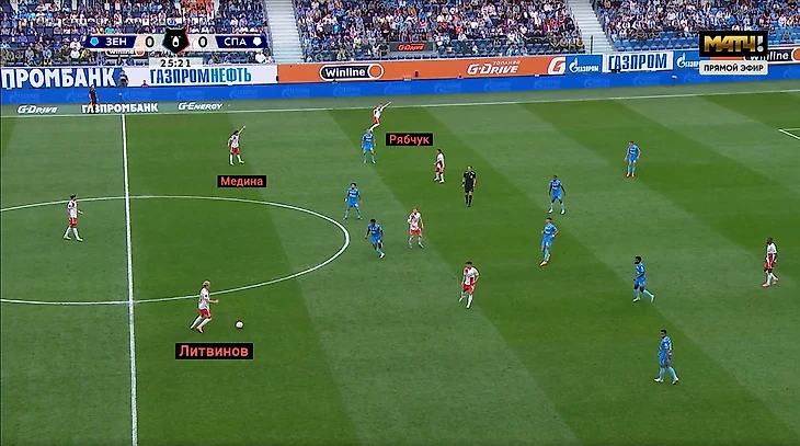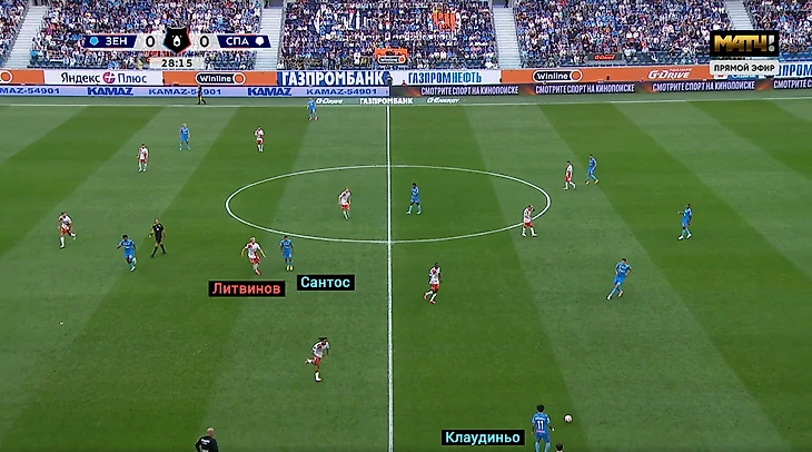 Единственная причина, по которой Семак мог не хотеть убирать Сантоса с левого фланга, – атакующий потенциал. У «Зенита» мало получалось создавать в позиционных атаках и почти все попытки выхода вперёд – забросы в зону Литвинова. Хозяева регулярно заставляли соперника прессинговать и «Спартак» смело шёл в давление. Больше всех из-за смен позиций рисковал Литвинов – центральный защитник регулярно уходил в глубину за своим соперником.