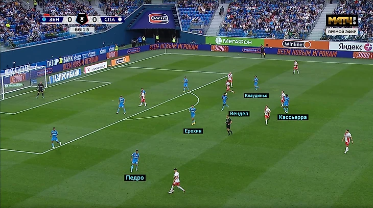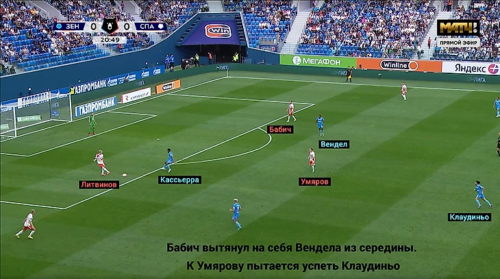 Кроме того, в центр вышел Ерохин. Это было связано с проблемами Вендела и Клаудиньо без мяча: в первом тайме полузащитники часто вытягивались на Бабича/Литвинова и в середине Умяров оставался один.