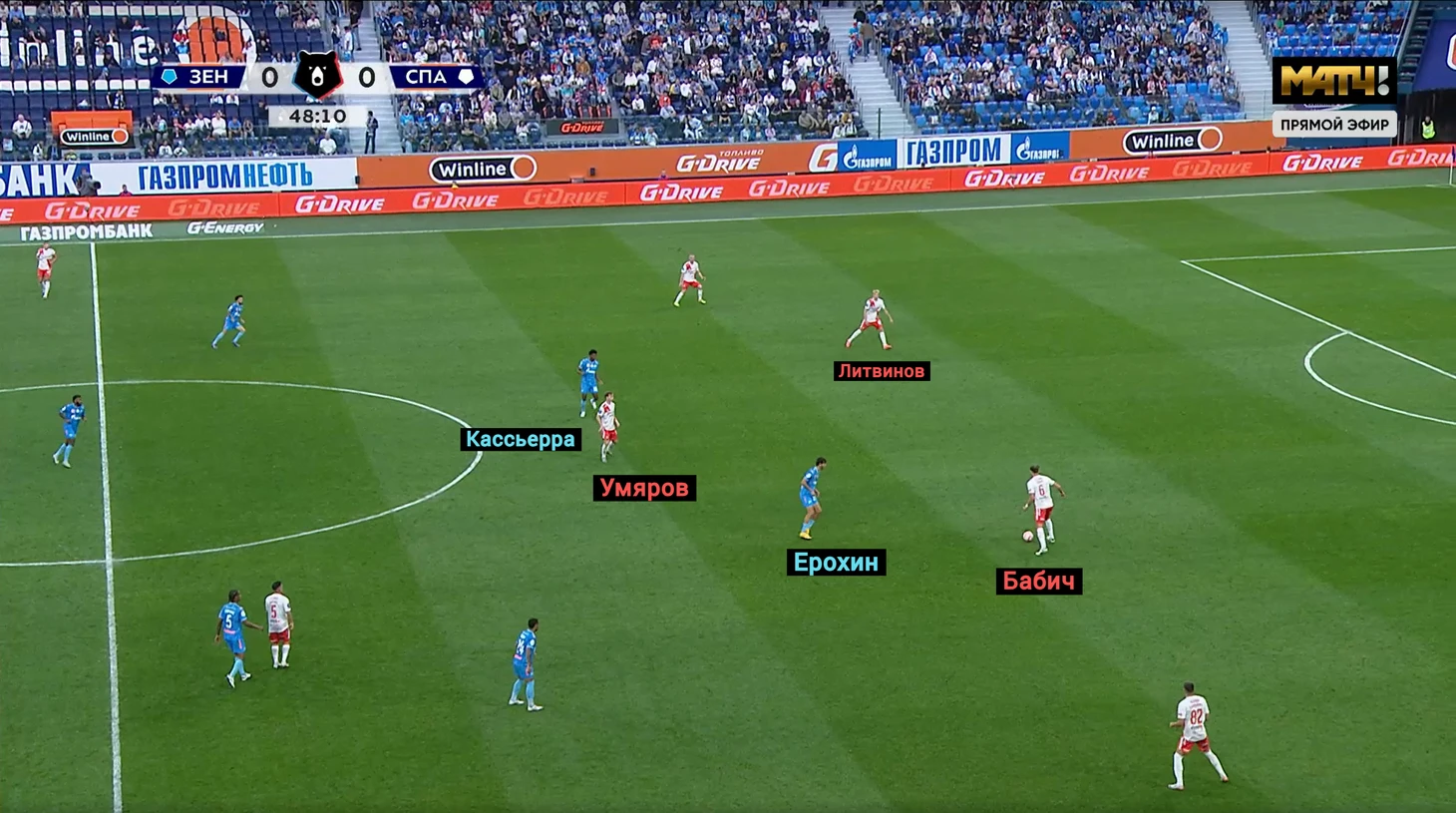 После удаления «Зенит» глубоко садился на своей половине. Иногда в последней линии находились сразу 6 человек и атаками у «Спартака» управляли центральные защитники. В этой ситуации Станкович выпустил Пруцева вместо Умярова на позицию шестёрки.
