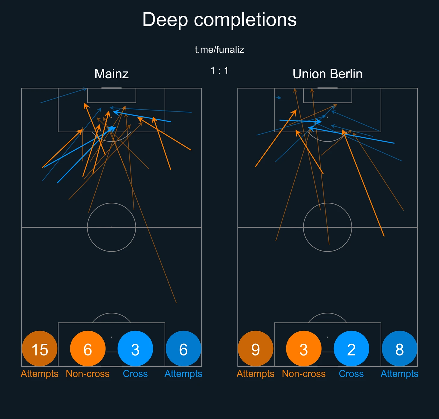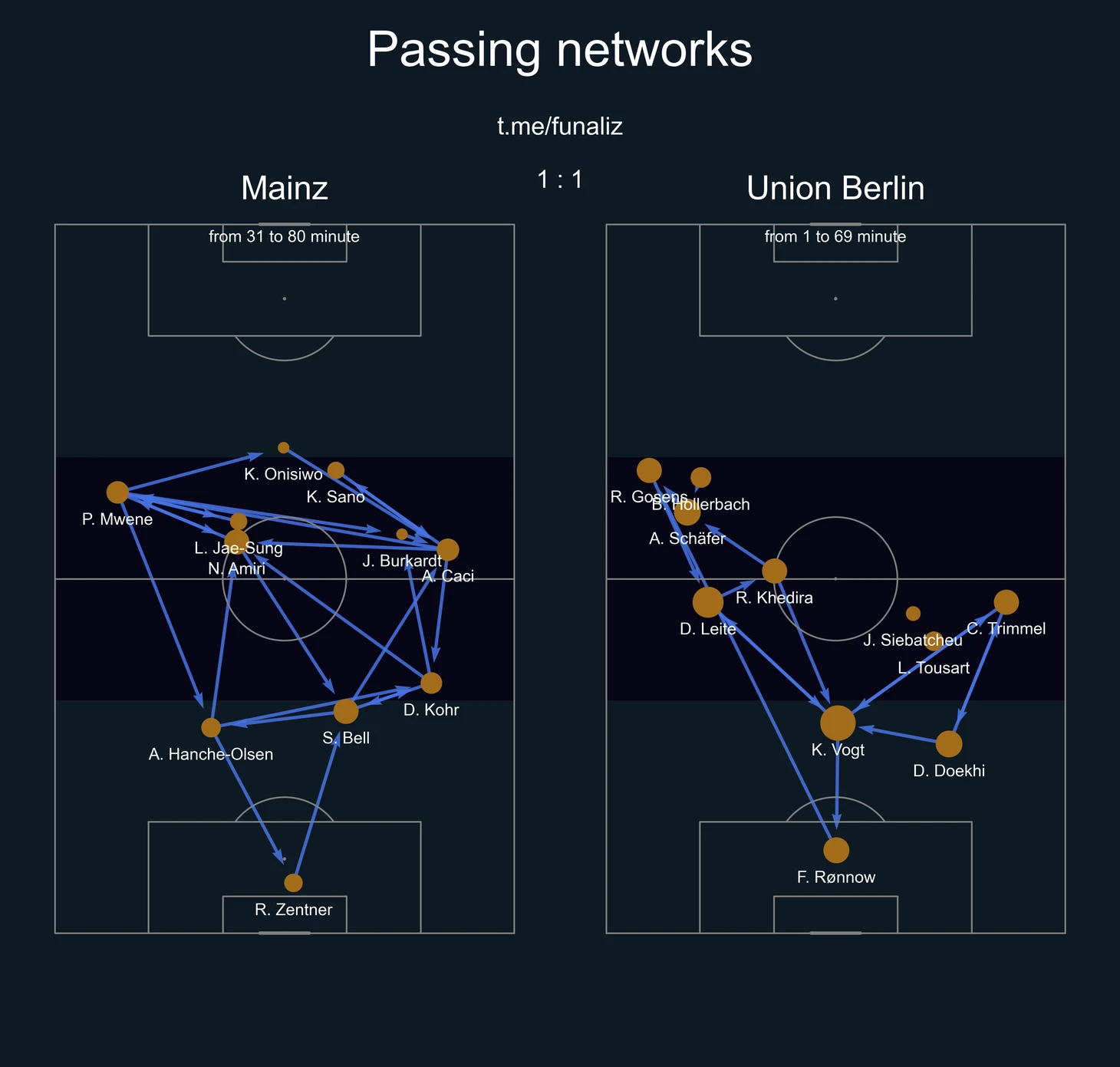 В атаке понравилась связка Гозенс - Шефер - Холлербах слева, все могут дать контроль мяча, есть попытки розыгрыша через треугольник, плюс могут стянуть на себя соперников у боковой линии освобождая пространство в чужой штрафной, так однажды вывели за спину защитникам Хедиру. Однако, «Майнц» пользовался постоянно высокой позицией Гозенса и на протяжении всего первого тайма угрожал воротам «Униона» через этот фланг: цз либо не успевали сместиться, либо, смещаясь, слишком открывали противоположную половину поля. При чём это касается как контратак соперника, когда Робин застревает в финальной трети, так и при позиционной обороне, когда поднимается и образует в средней линии с тремя полузащитниками линию из четвёрки.